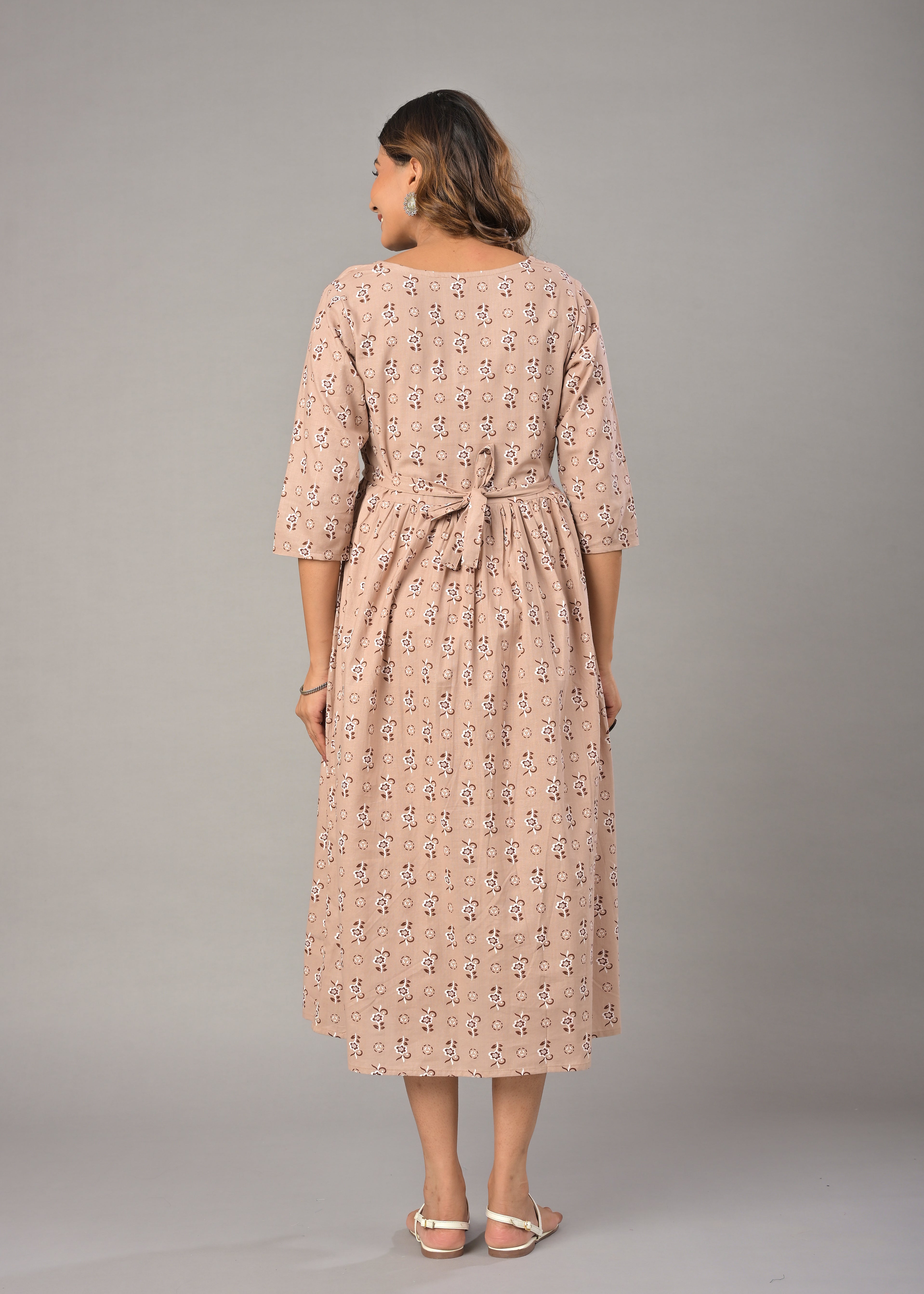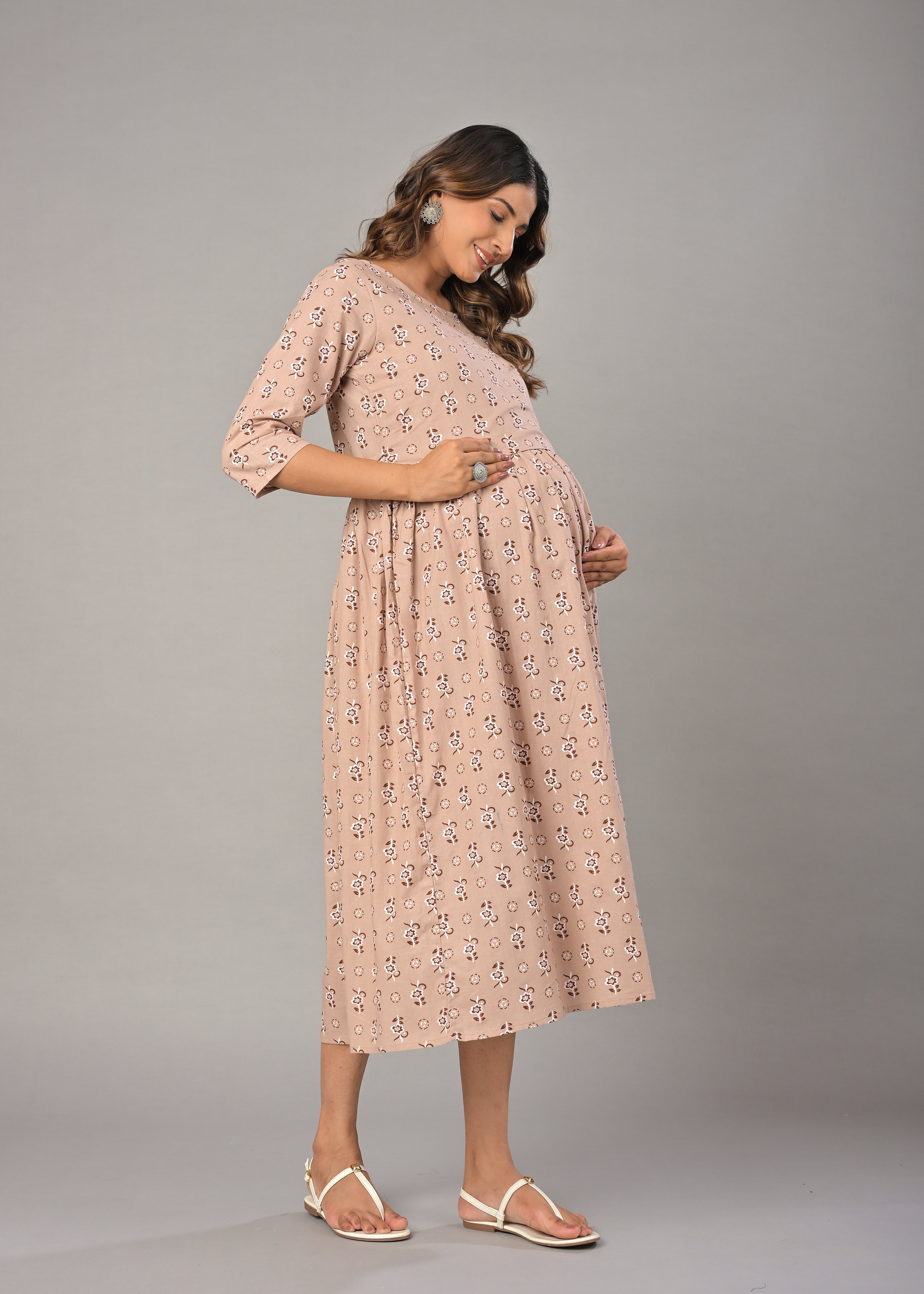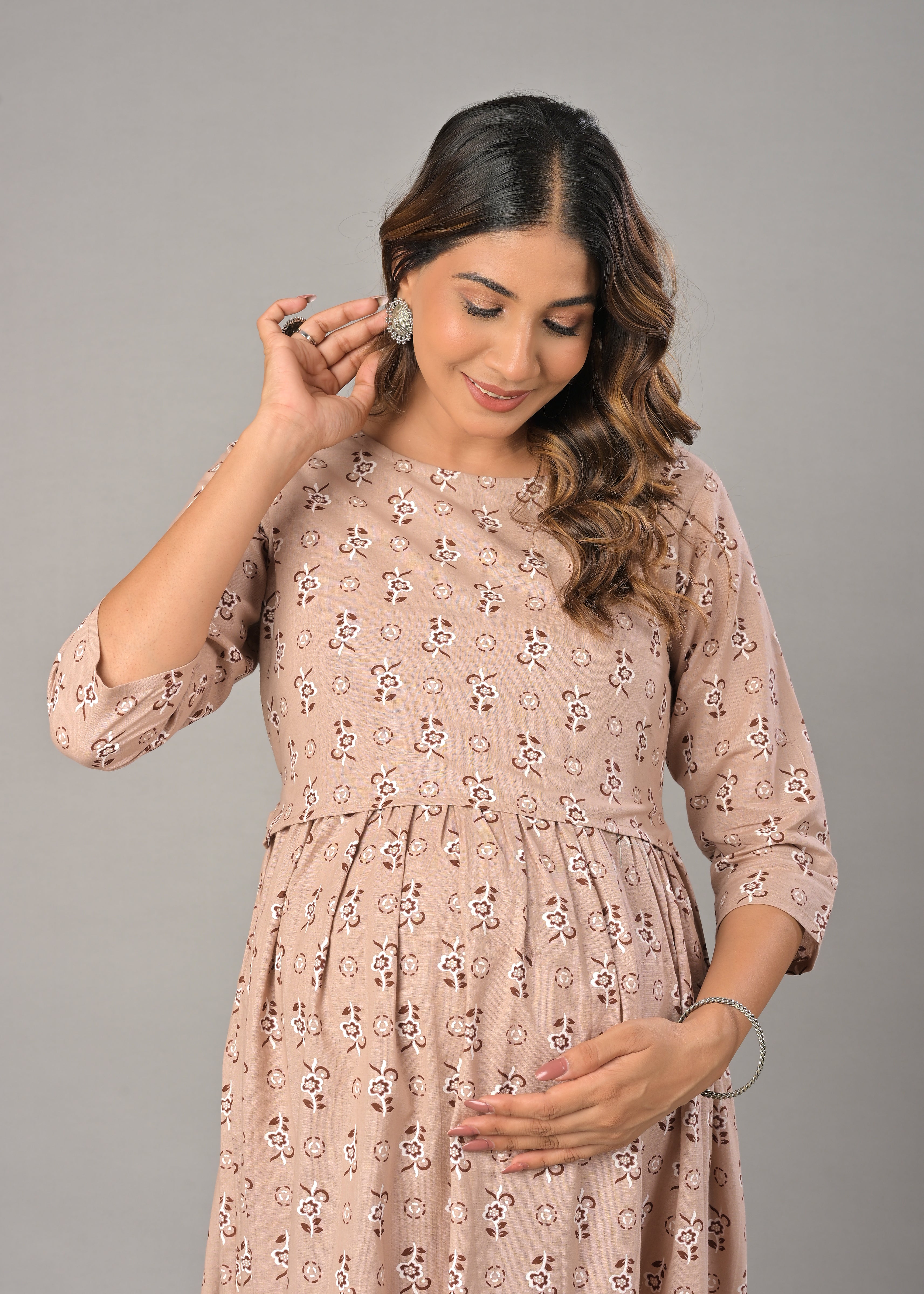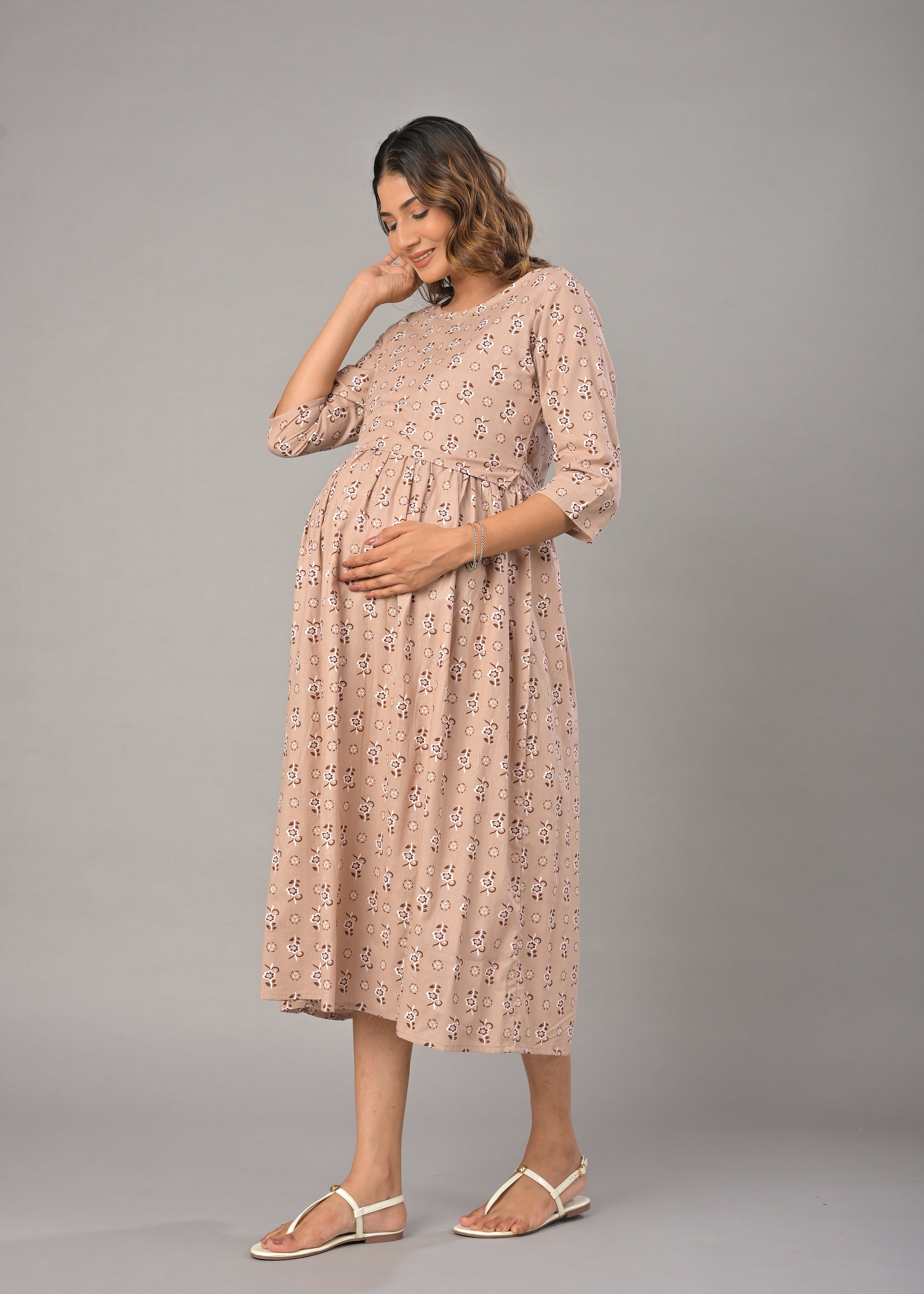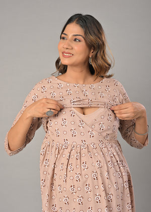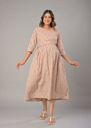 Beige Cotton Printed Maternity/Feeding Gown