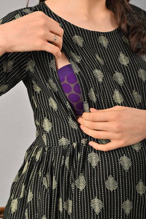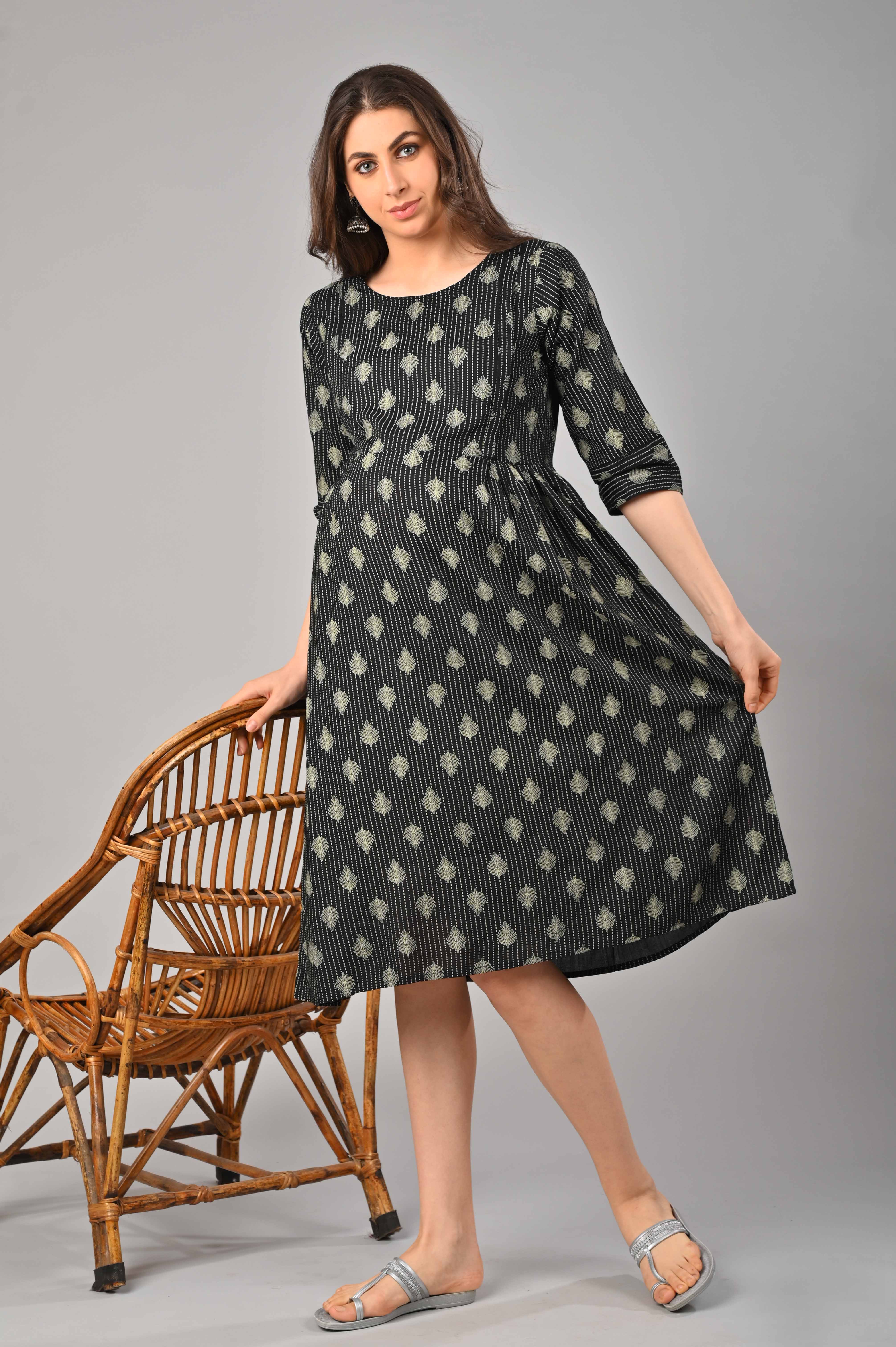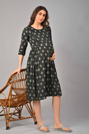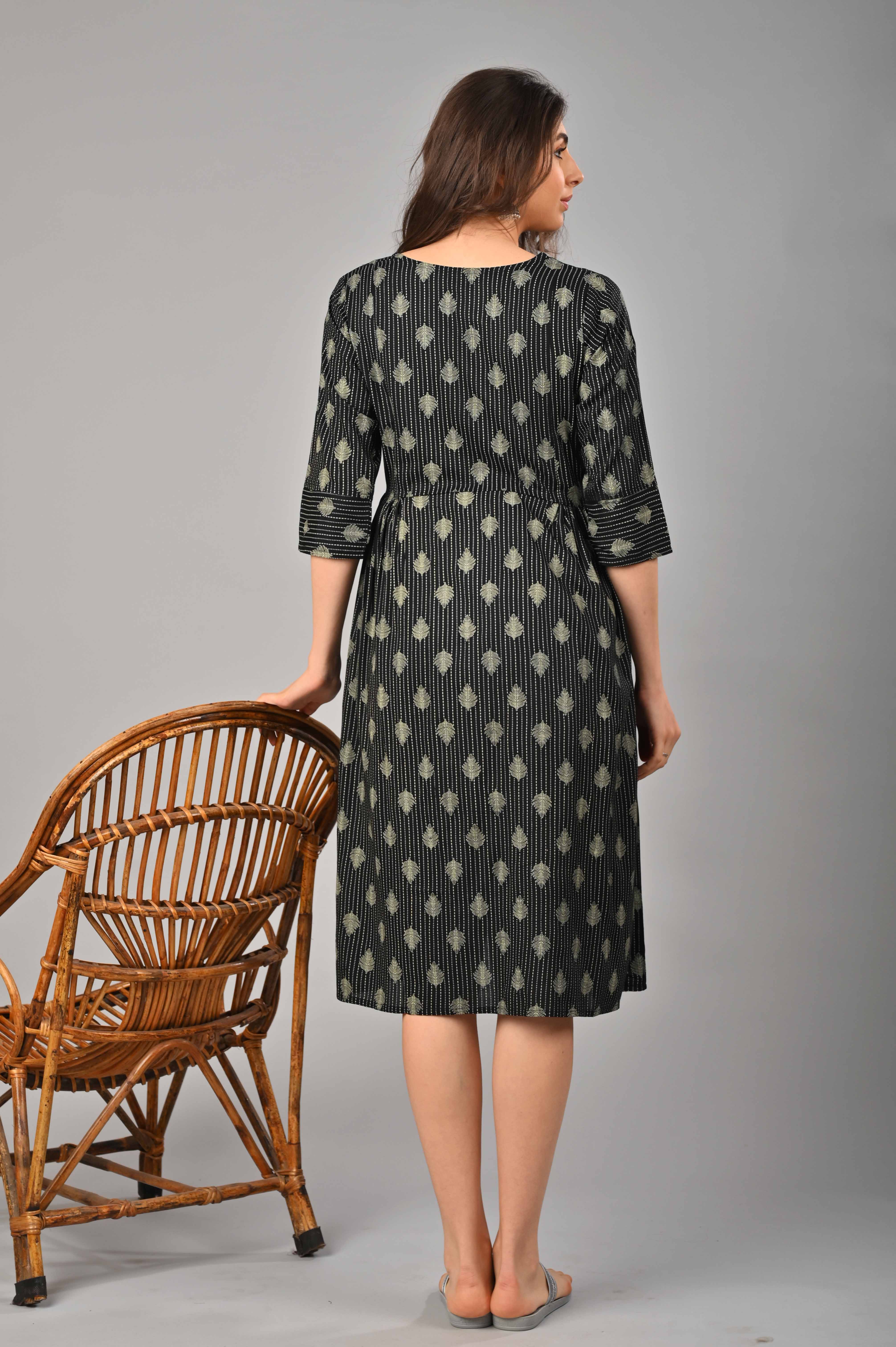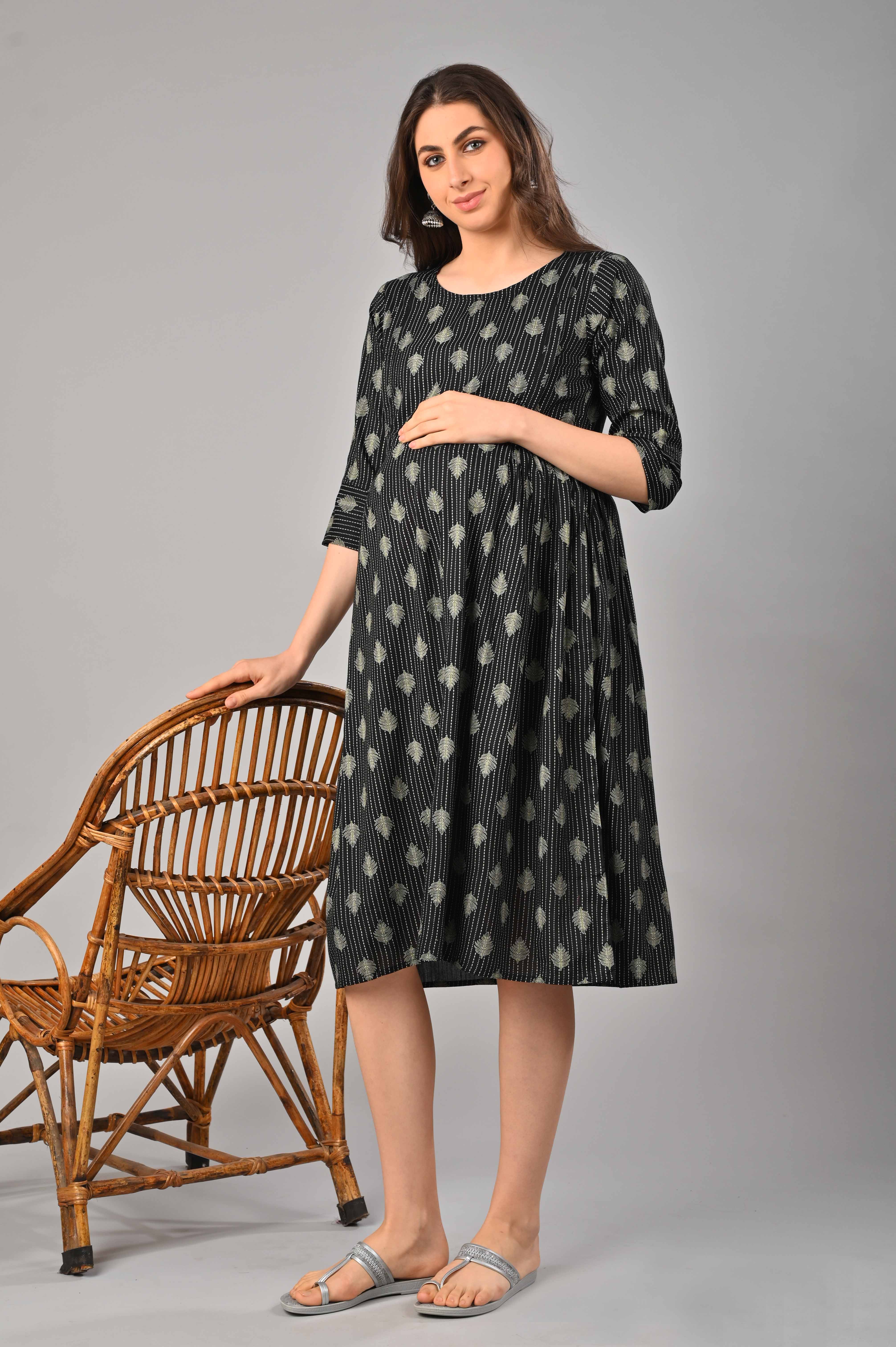 Introducing our Black Cotton Printed Maternity/Feeding Gown. This gown is made of soft and breathable cotton, perfect for your comfort during pregnancy and breastfeeding. The beautiful print adds a touch of style to this functional and practical piece. Invest in your comfort and style with our Mustard Cotton Printed Maternity/Feeding Gown.