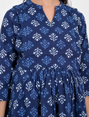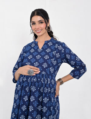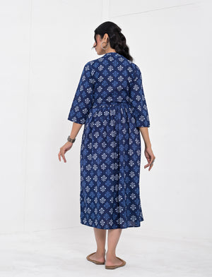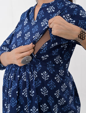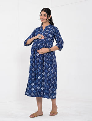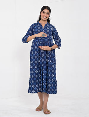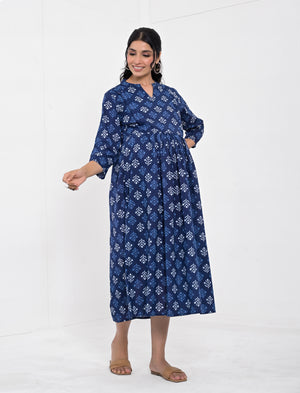 Blue Butta Printed Cotton Maternity/Feeding Gown