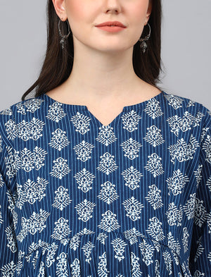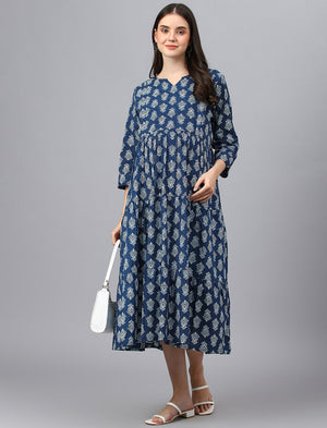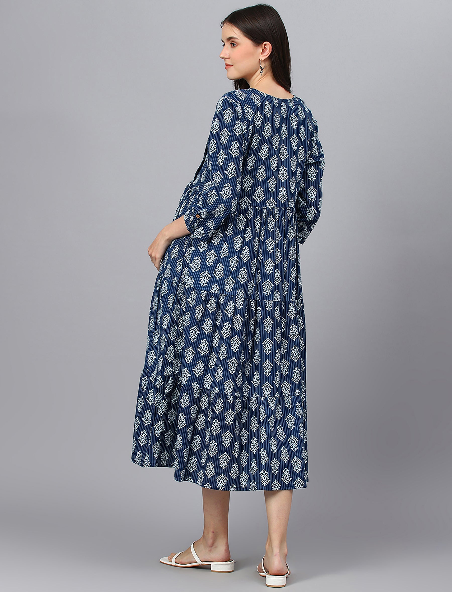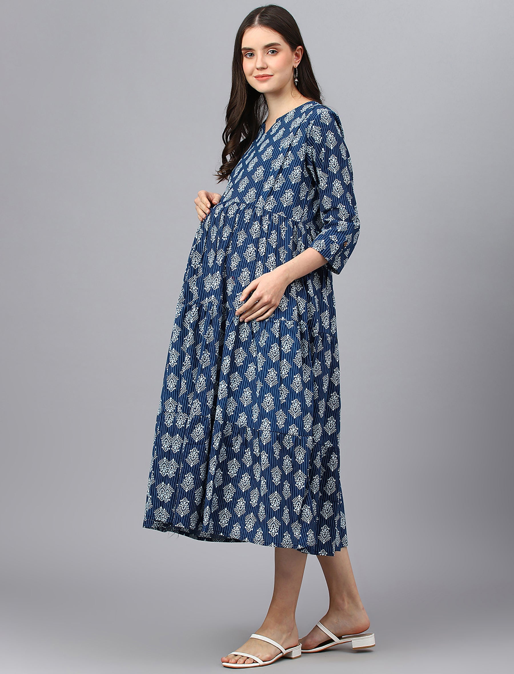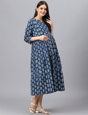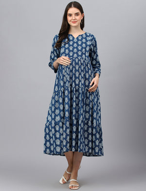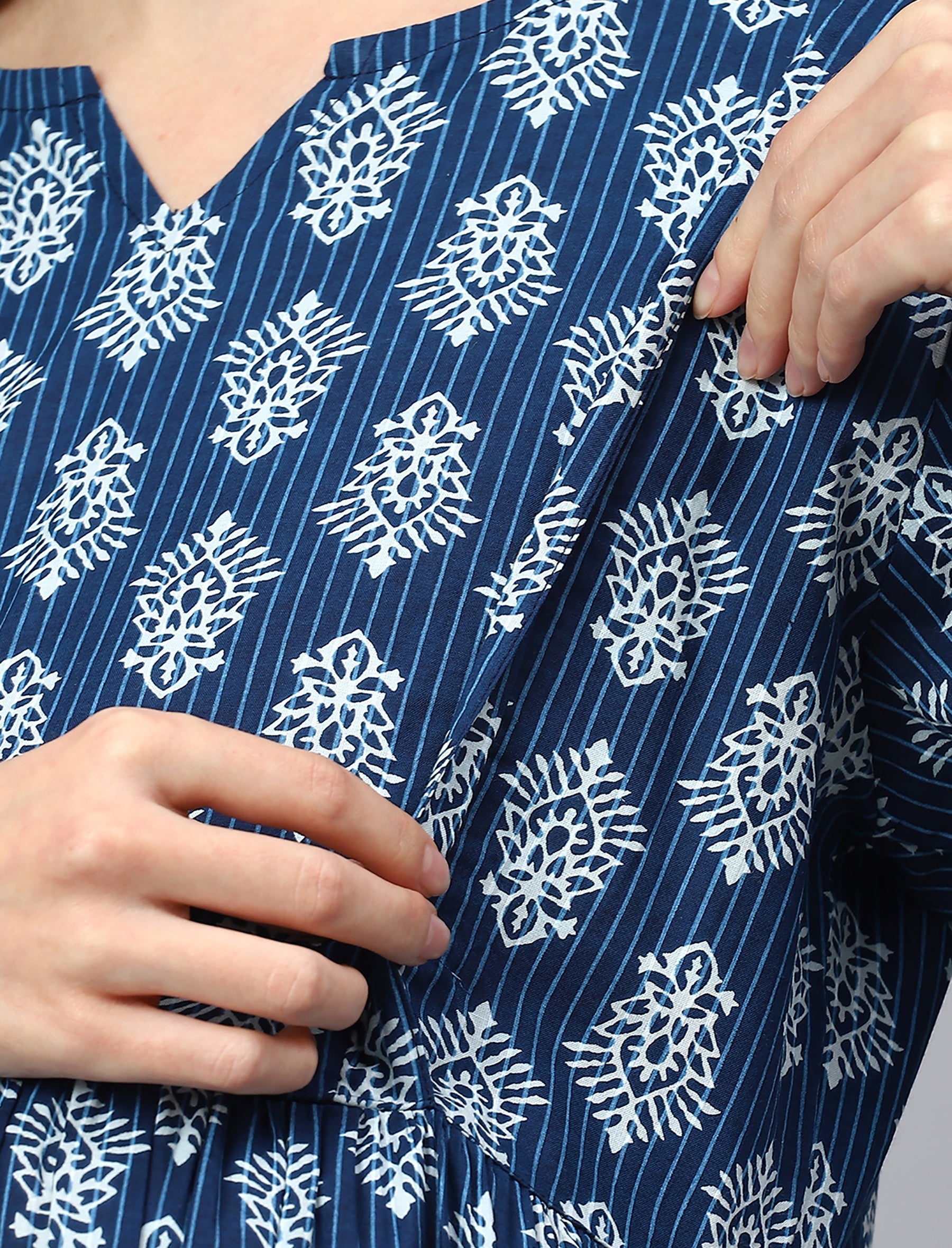 Blue Butta Printed Cotton Maternity/Feeding Gown