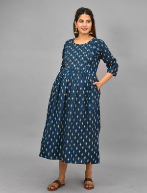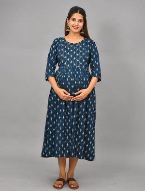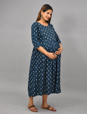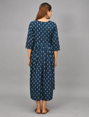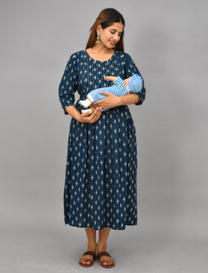 Blue Butti Printed Cotton Maternity/Feeding Gown