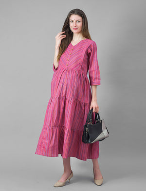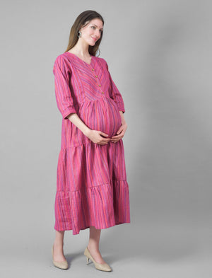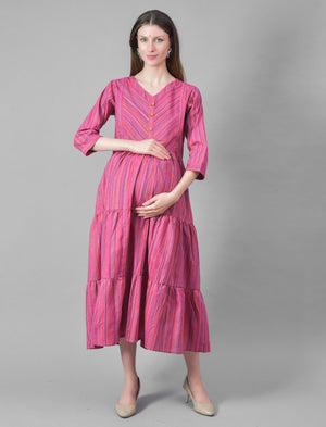 Dark Pink Printed Cotton Maternity/Feeding Gown