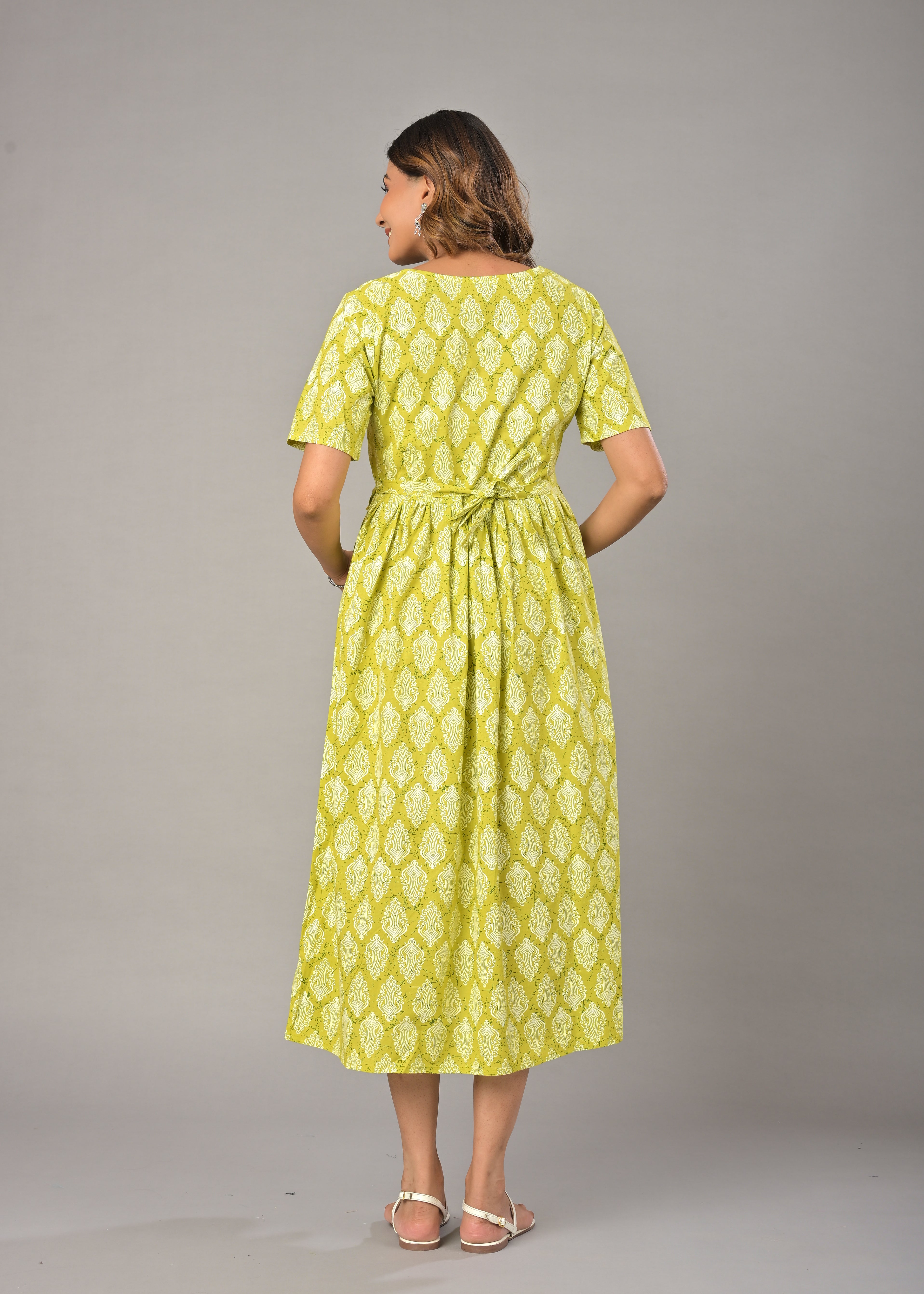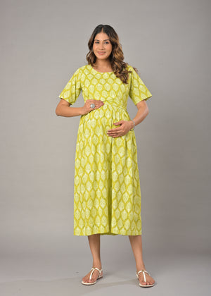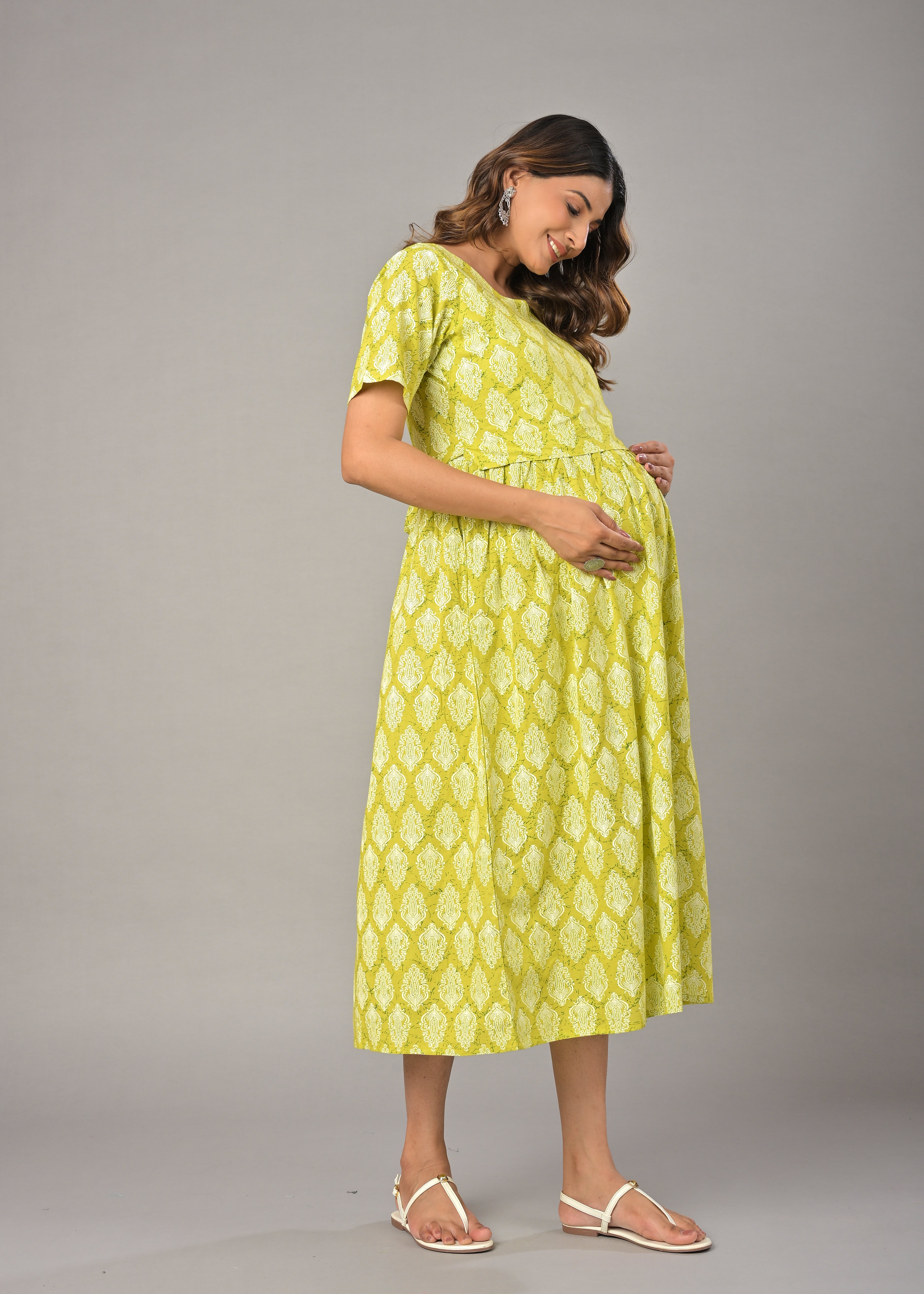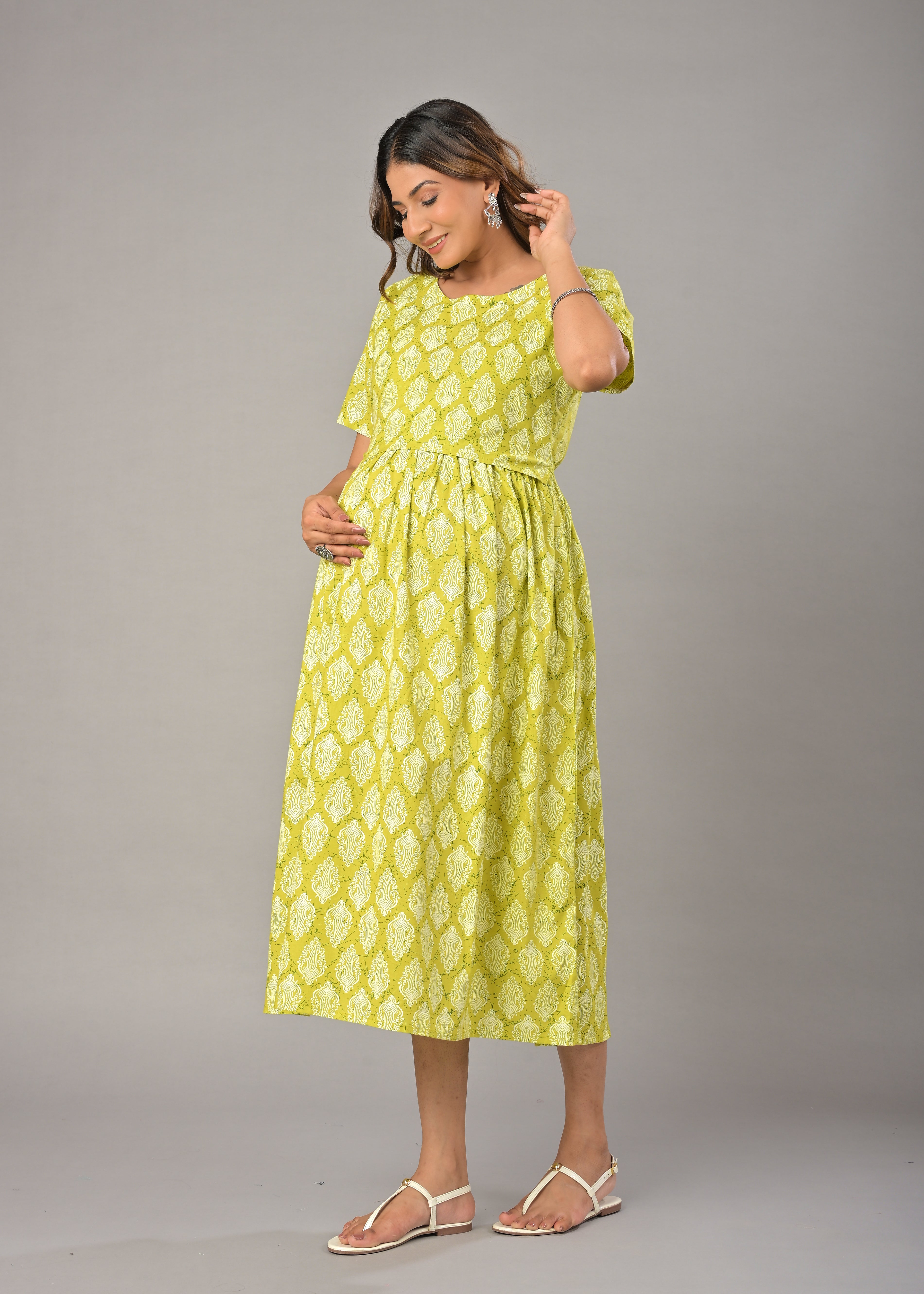 Introducing our Mustard Cotton Printed Maternity/Feeding Gown. This gown is made of soft and breathable cotton, perfect for your comfort during pregnancy and breastfeeding. The beautiful print adds a touch of style to this functional and practical piece. Invest in your comfort and style with our Mustard Cotton Printed Maternity/Feeding Gown.