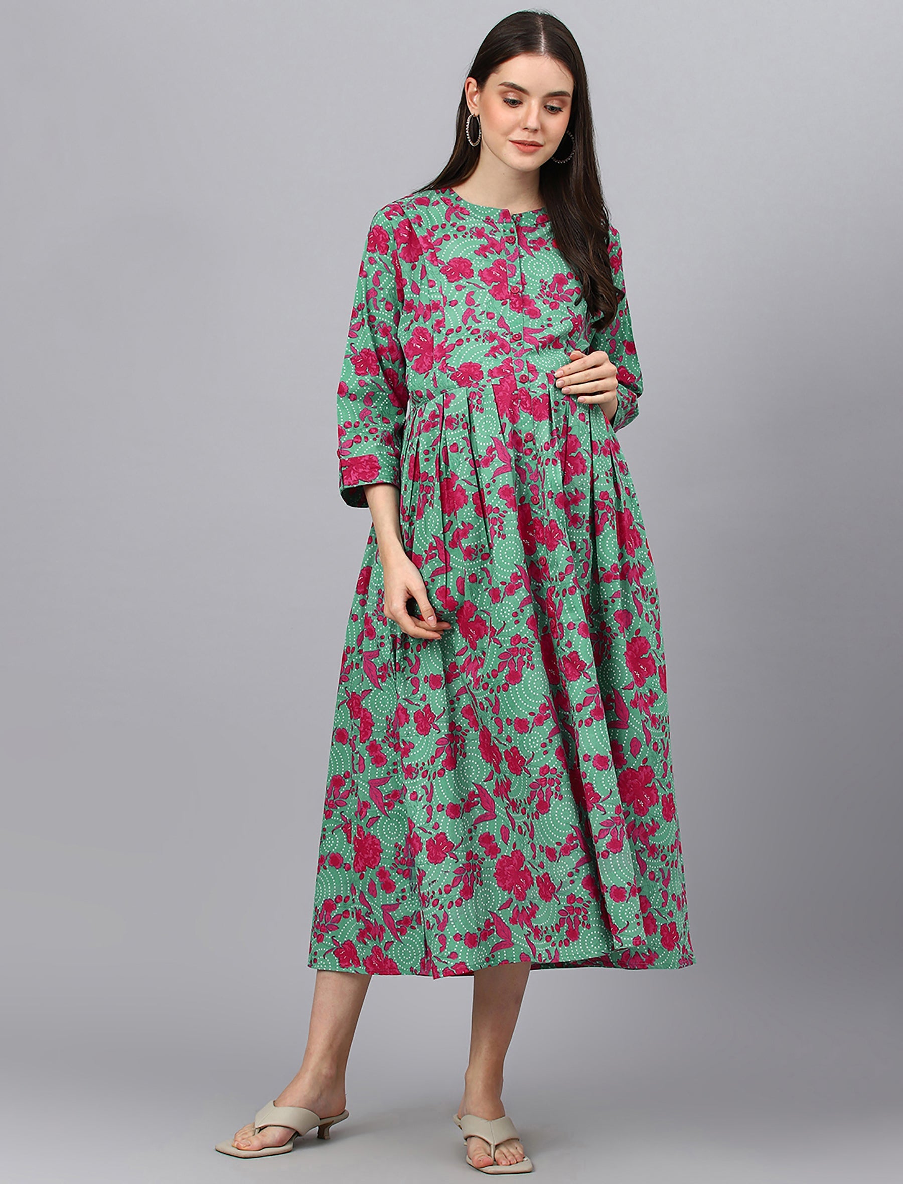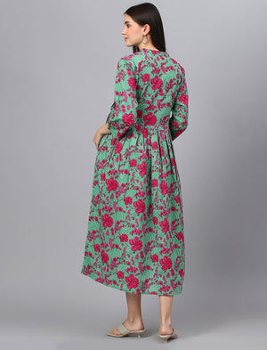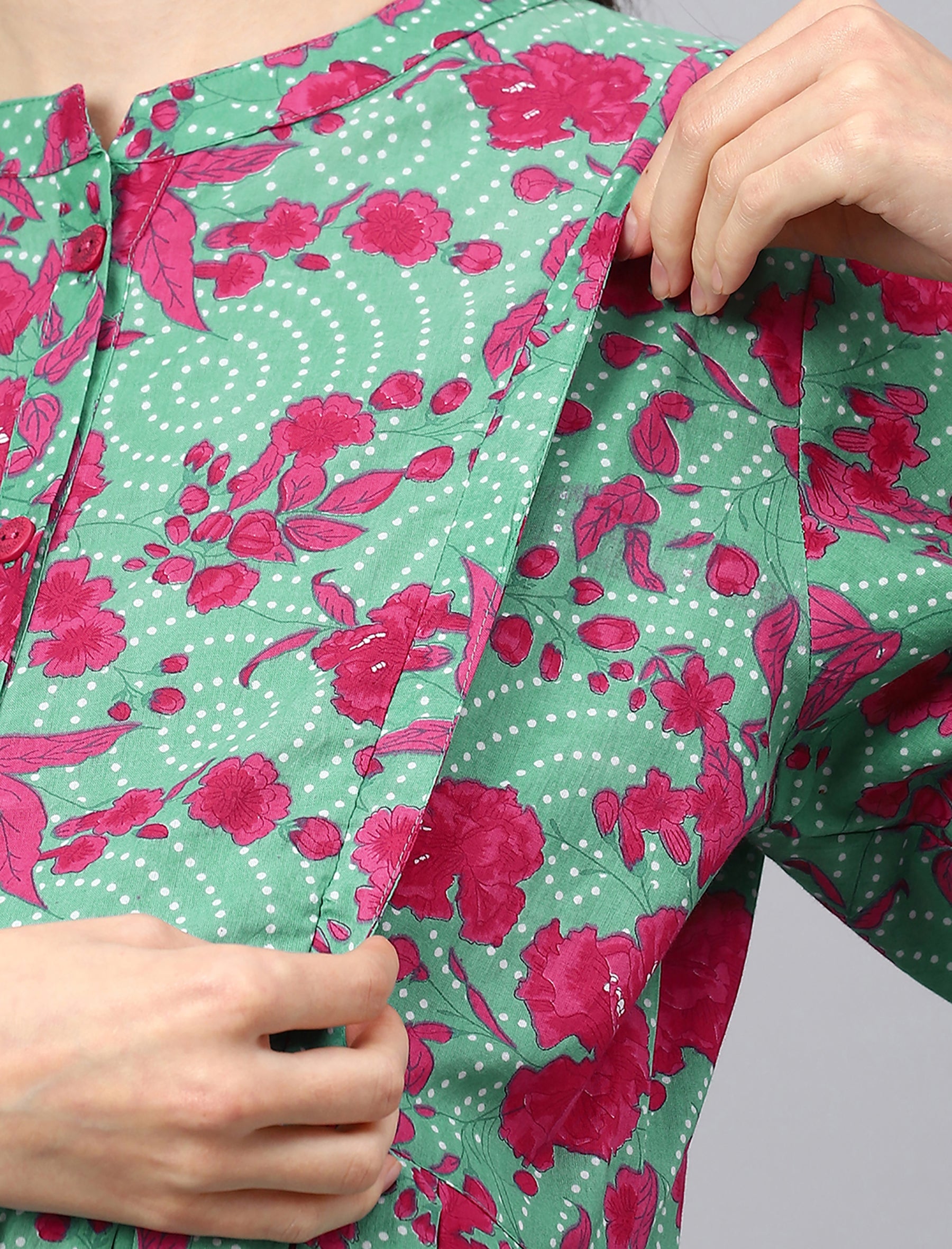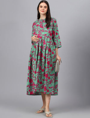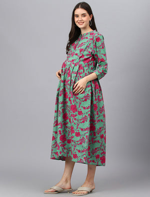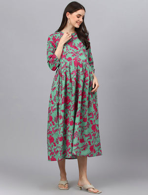 Green Printed Cotton Maternity/Feeding Gown