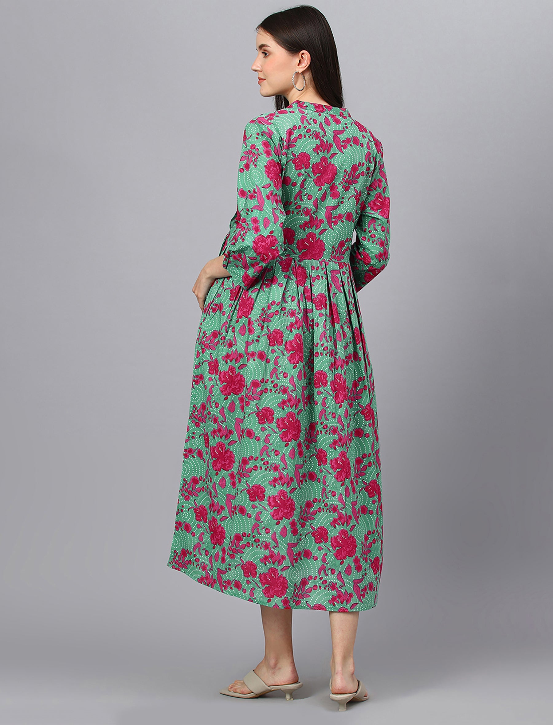 This green printed cotton gown is designed for both maternity and feeding purposes. Made with comfortable and breathable fabric, it offers a stylish and convenient option for new mothers. The gown allows for easy breastfeeding access, making it a functional and practical choice for everyday wear.