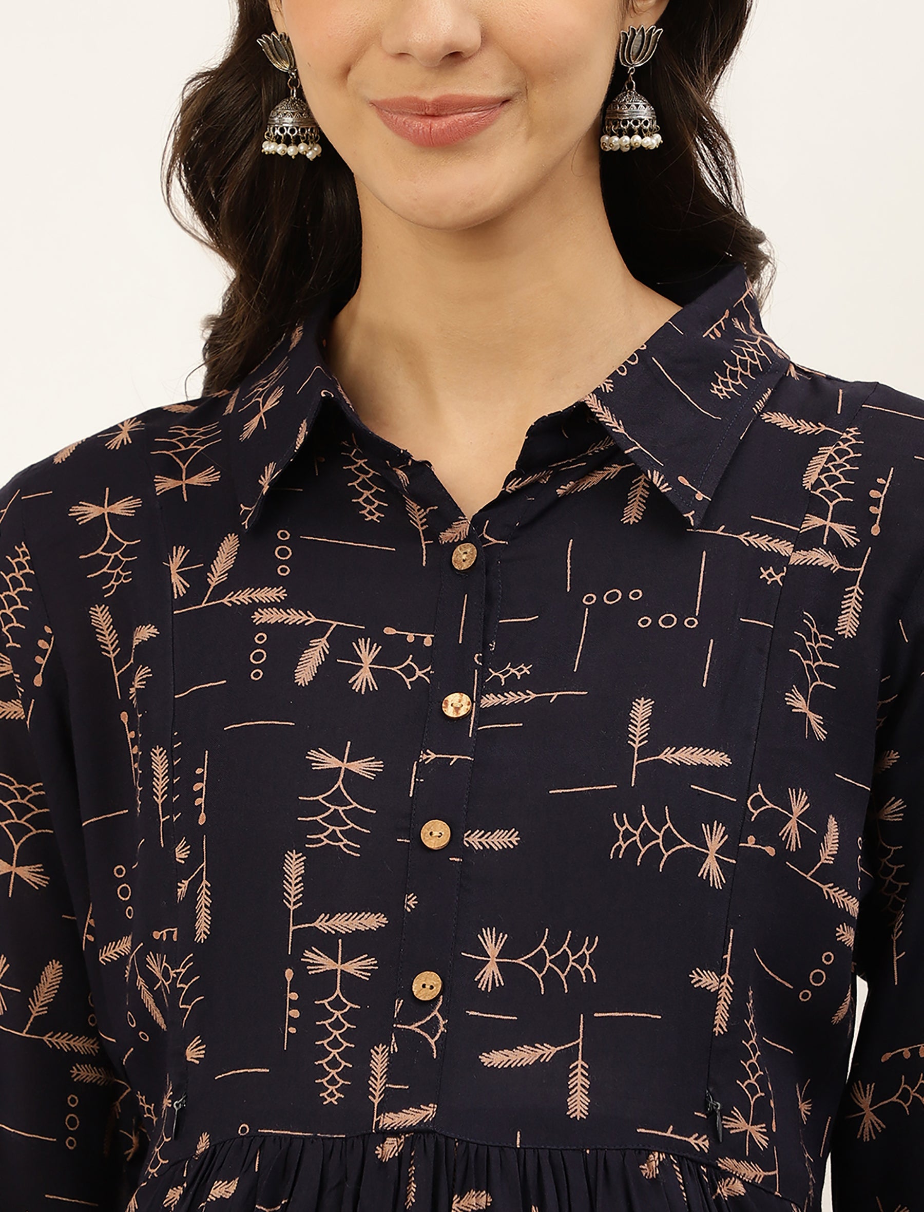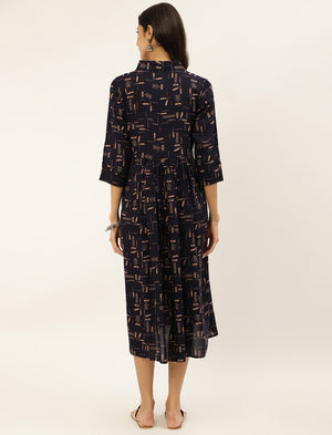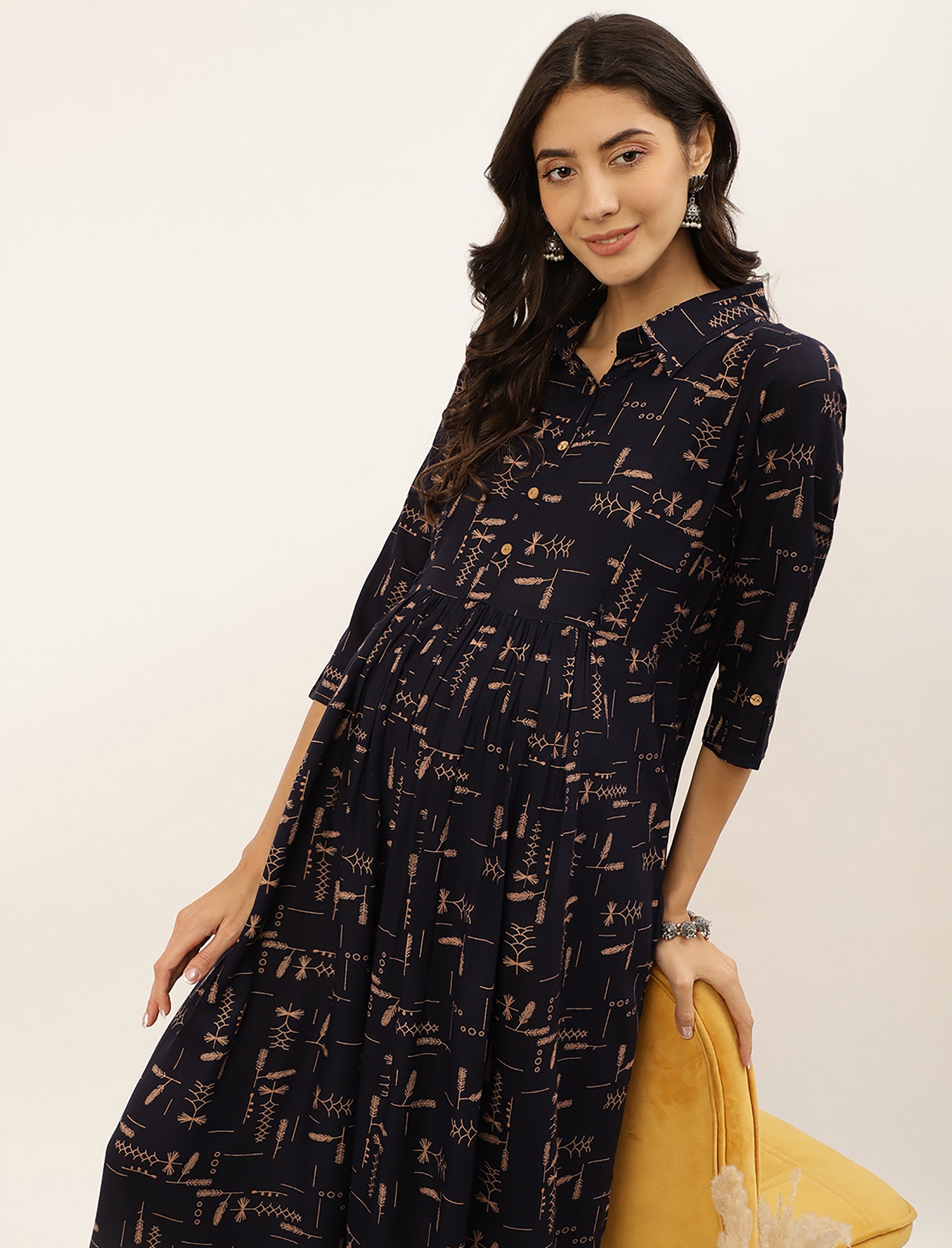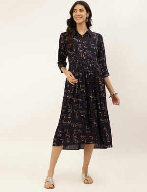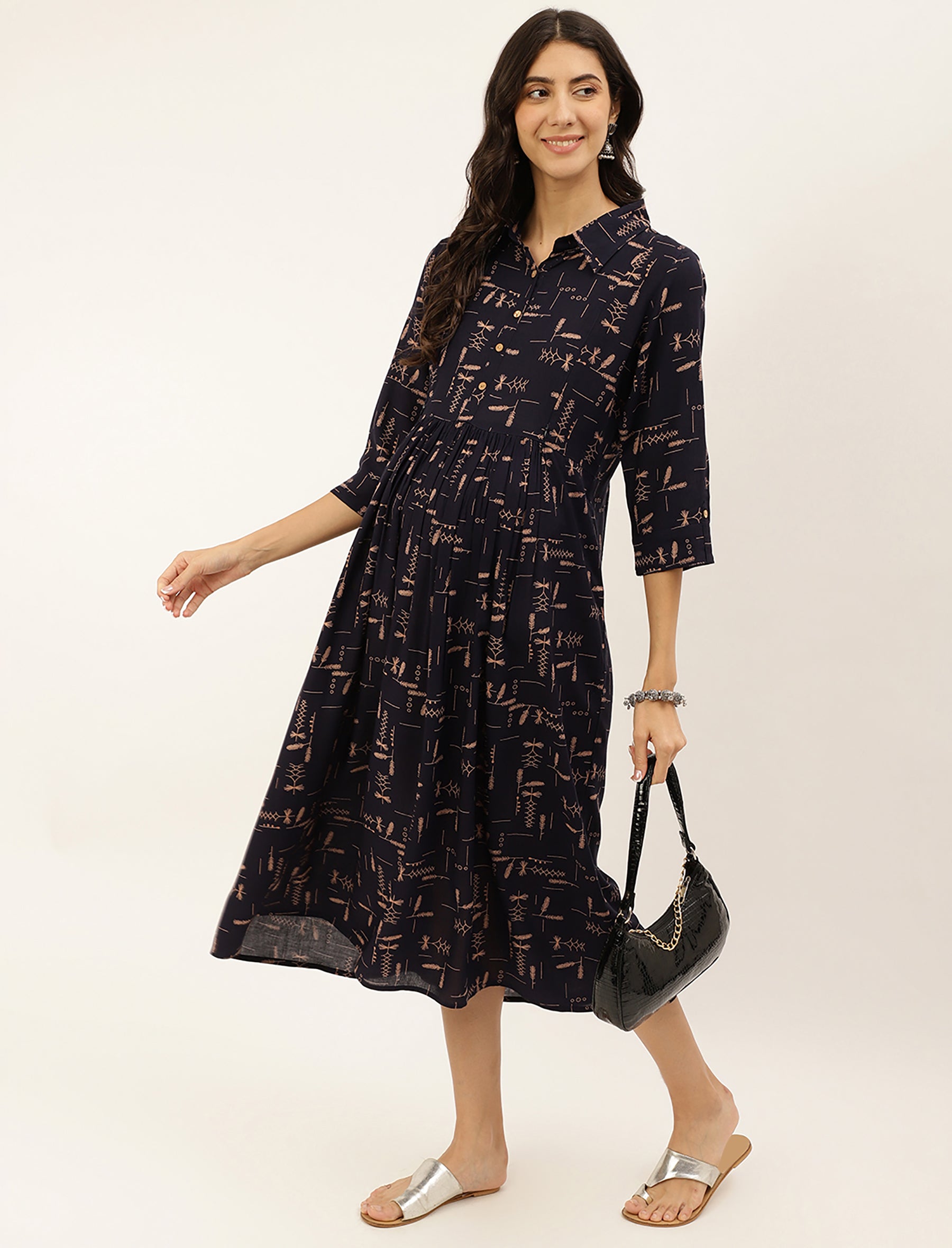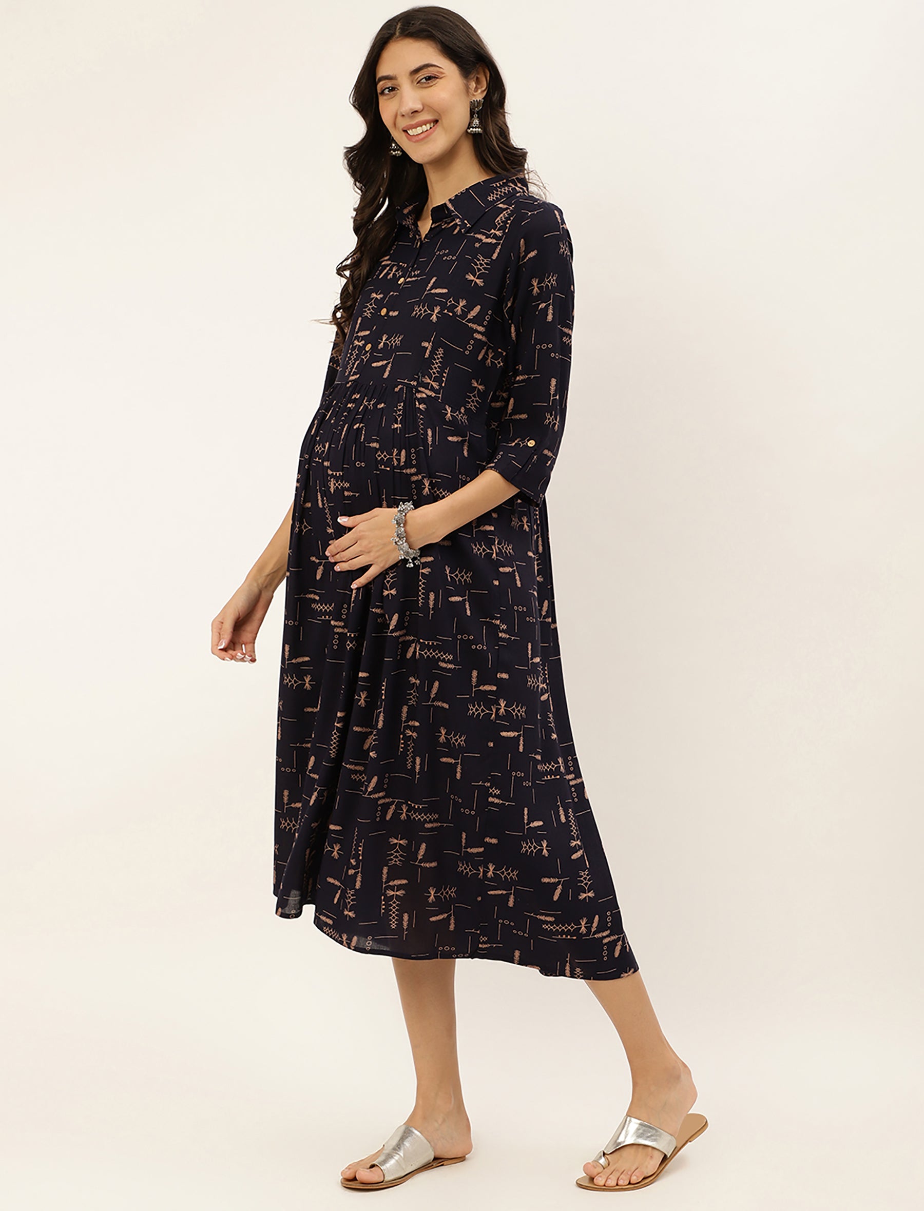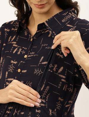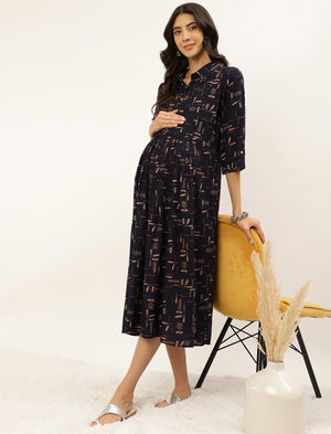 Introducing our Navy Golden Printed Cotton Maternity Gown, designed with comfort and style in mind. Made with cotton fabric, it provides a soft and breathable feel for expecting mothers. The elegant black and golden print adds a touch of sophistication, perfect for any occasion.