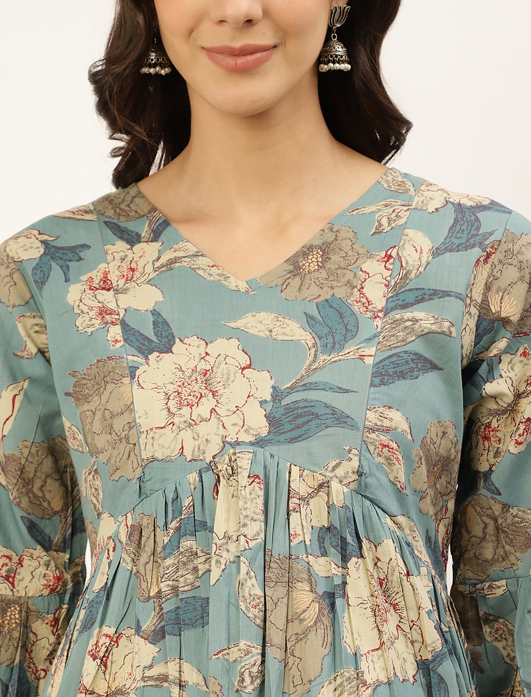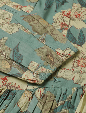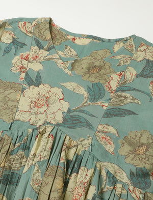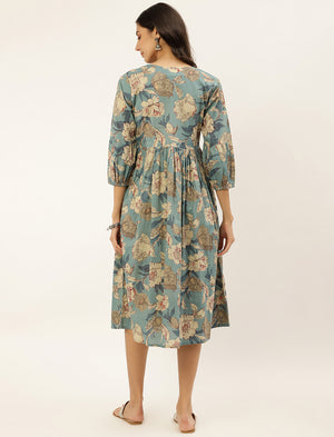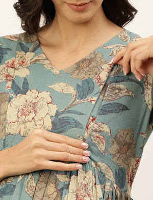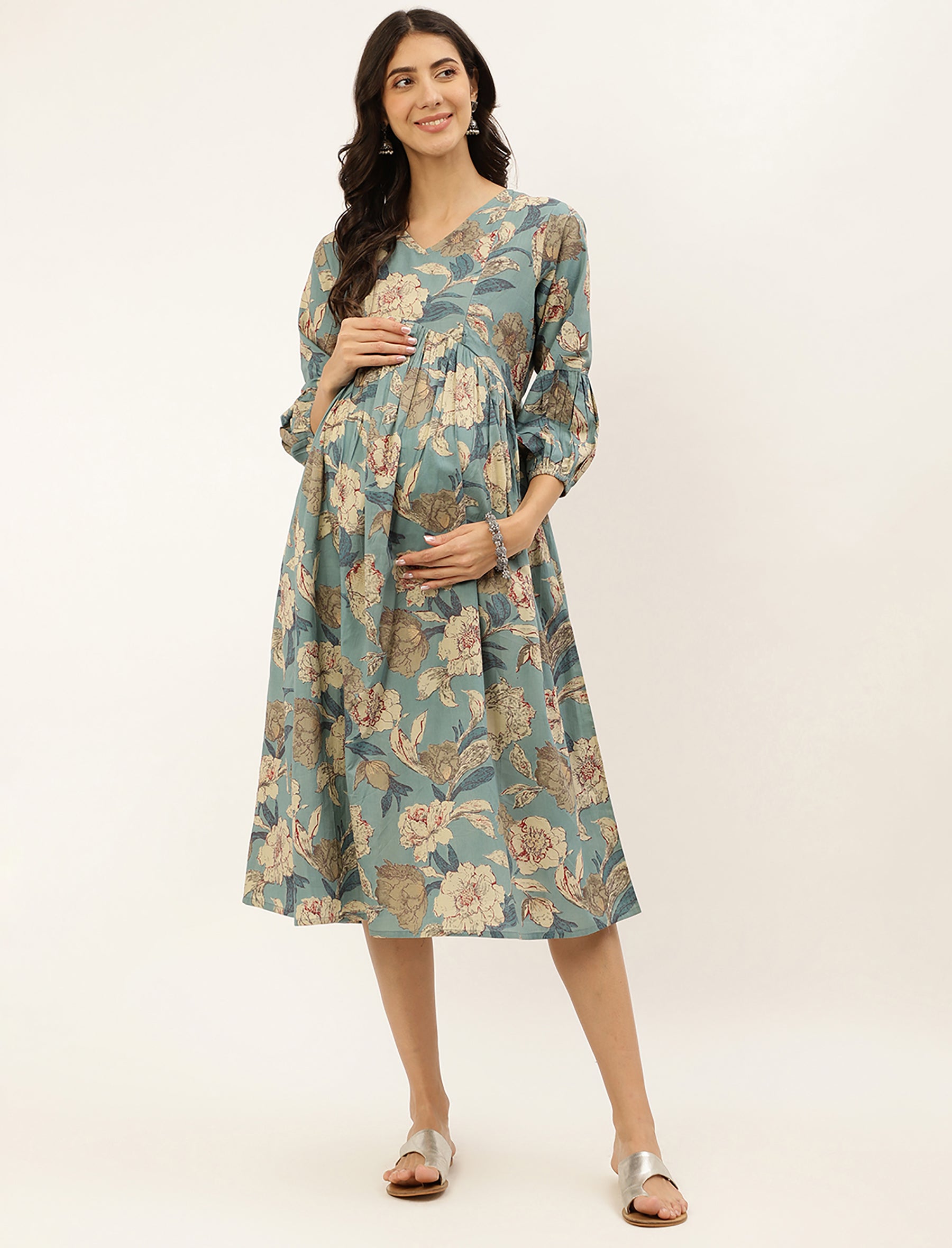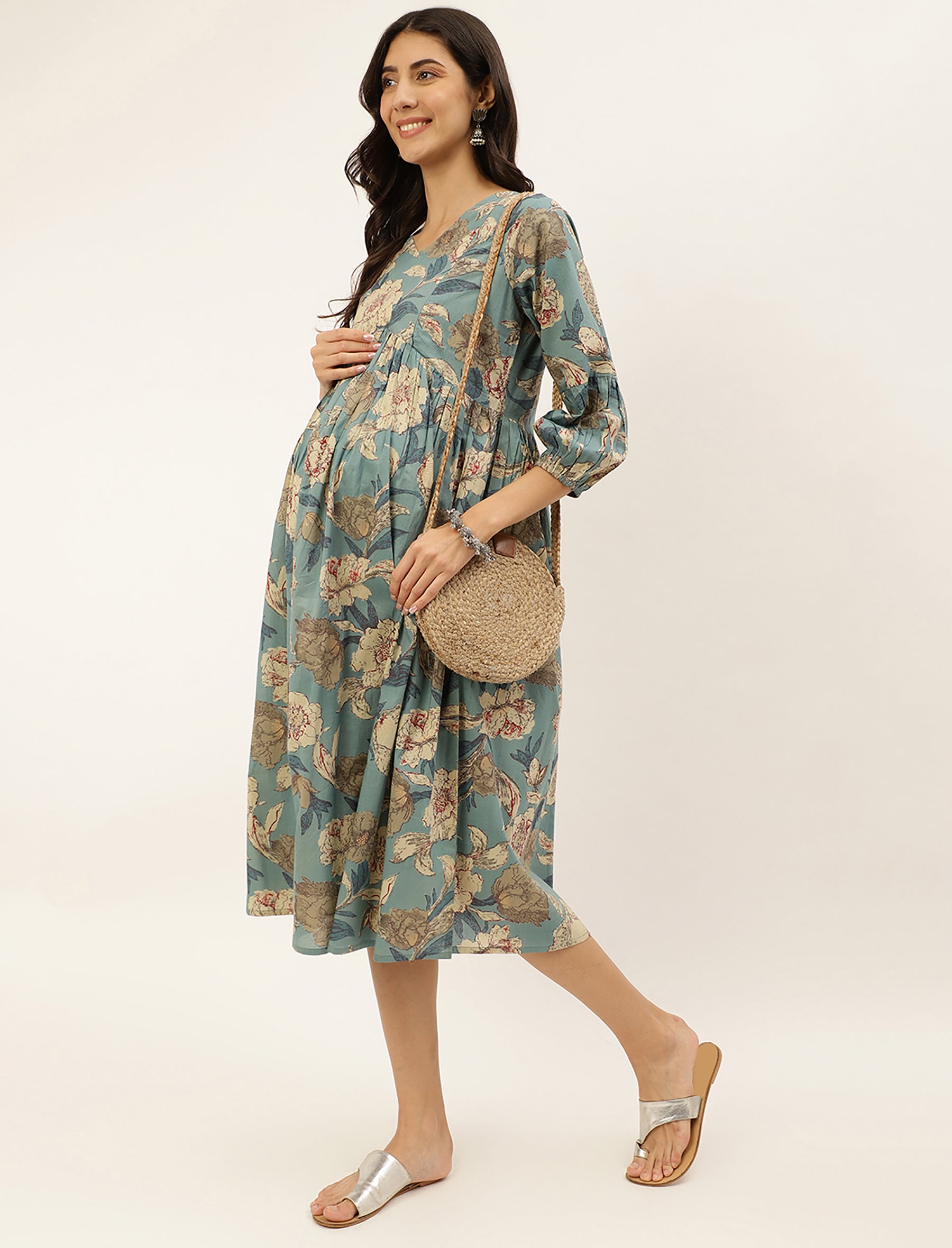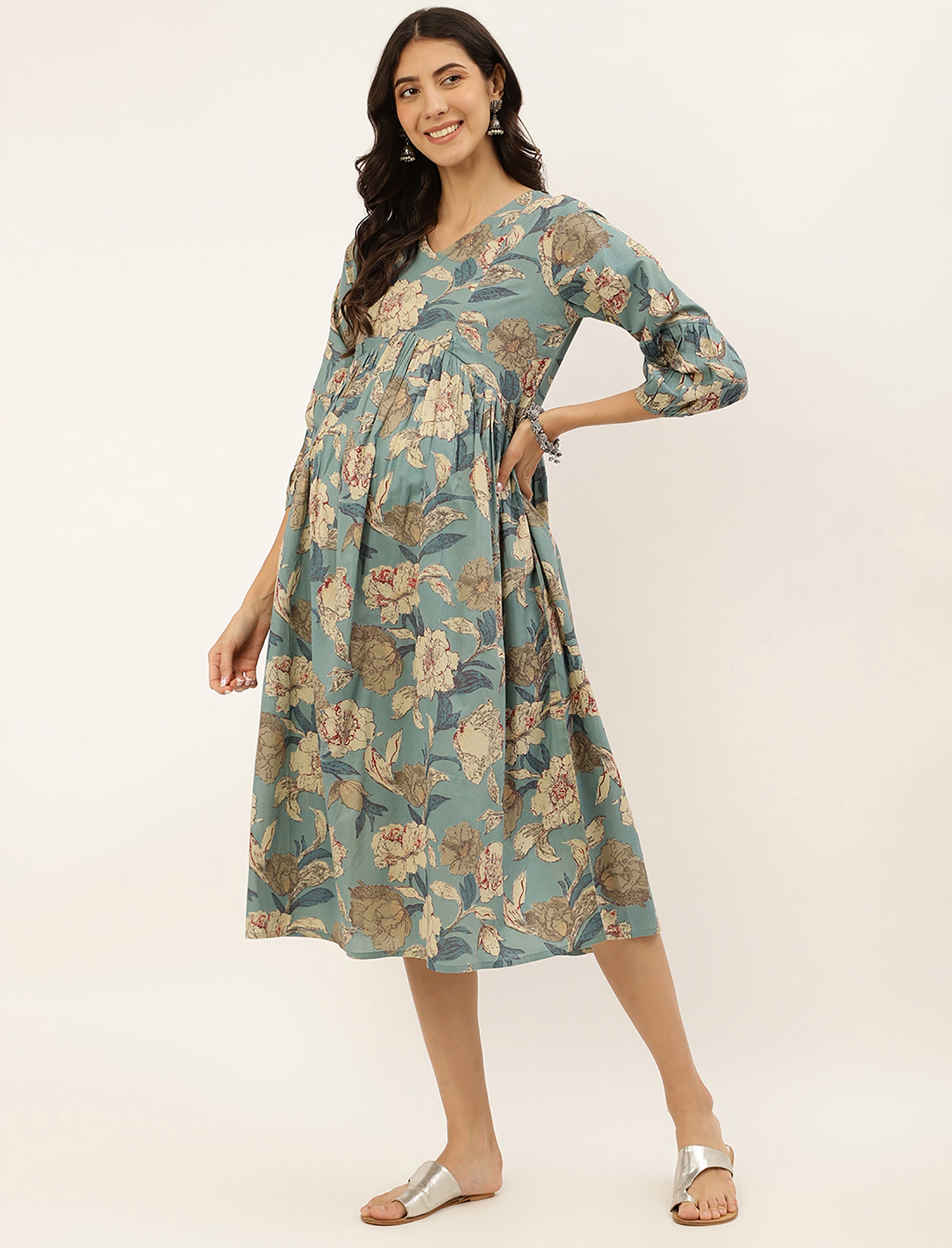 Sea Green Flower Printed Cotton Maternity/Feeding Gown