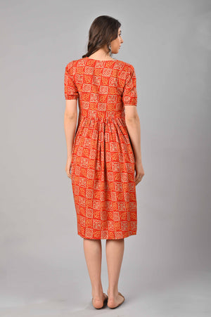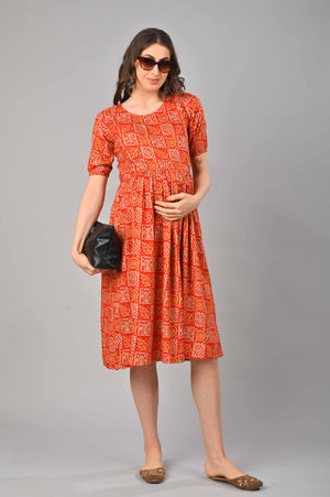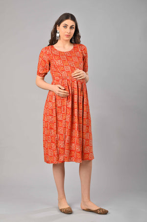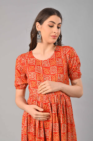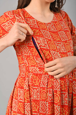 Red Cotton Printed Maternity/Feeding Gown