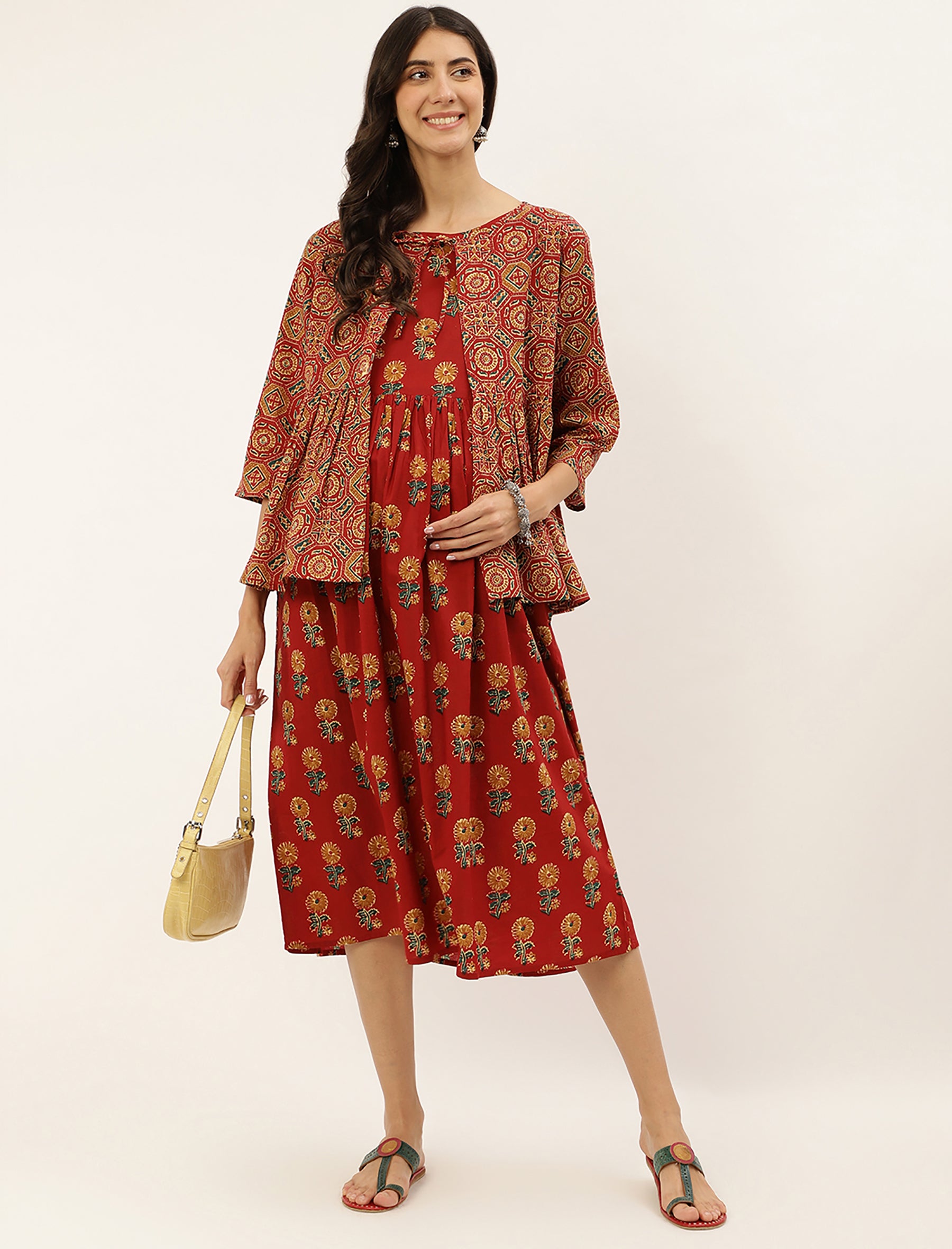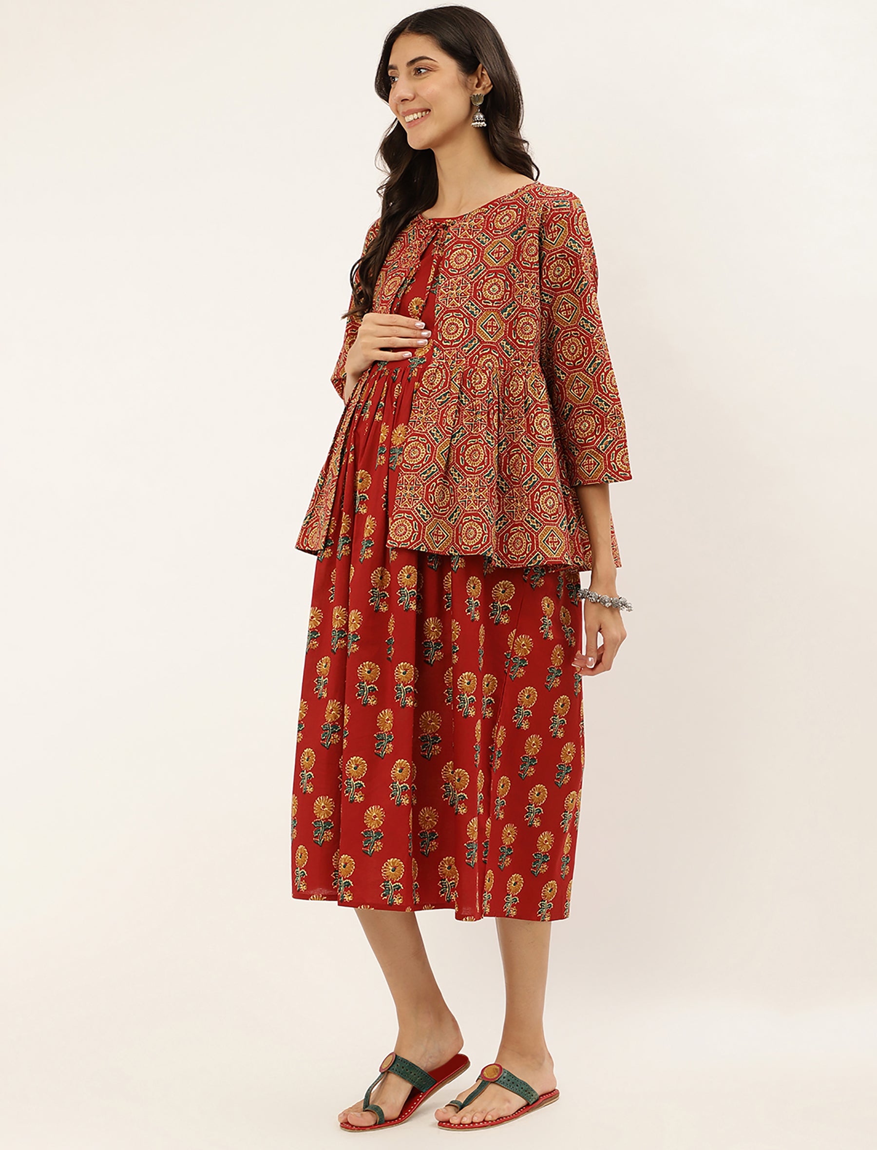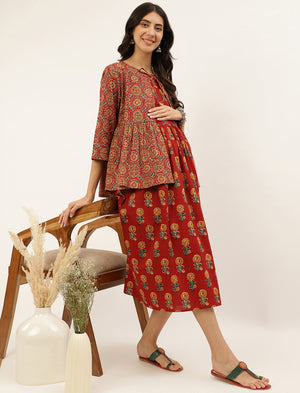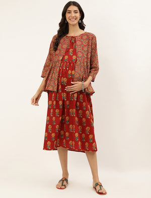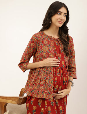 Red Butta Printed Cotton Maternity Gown With Jacket
