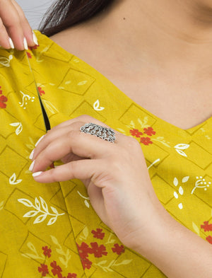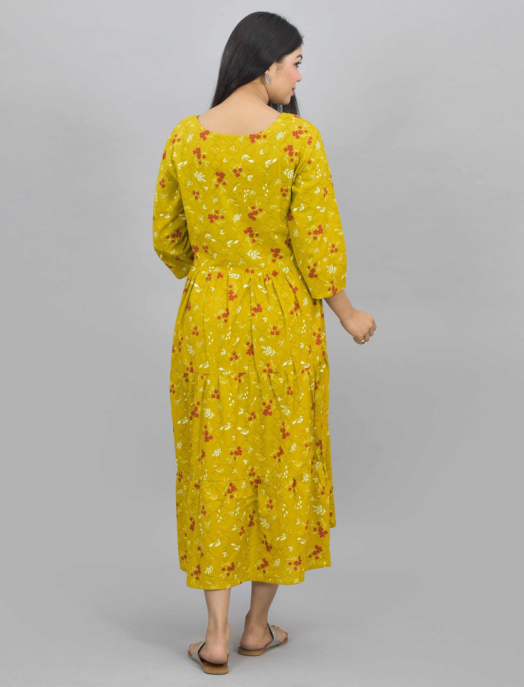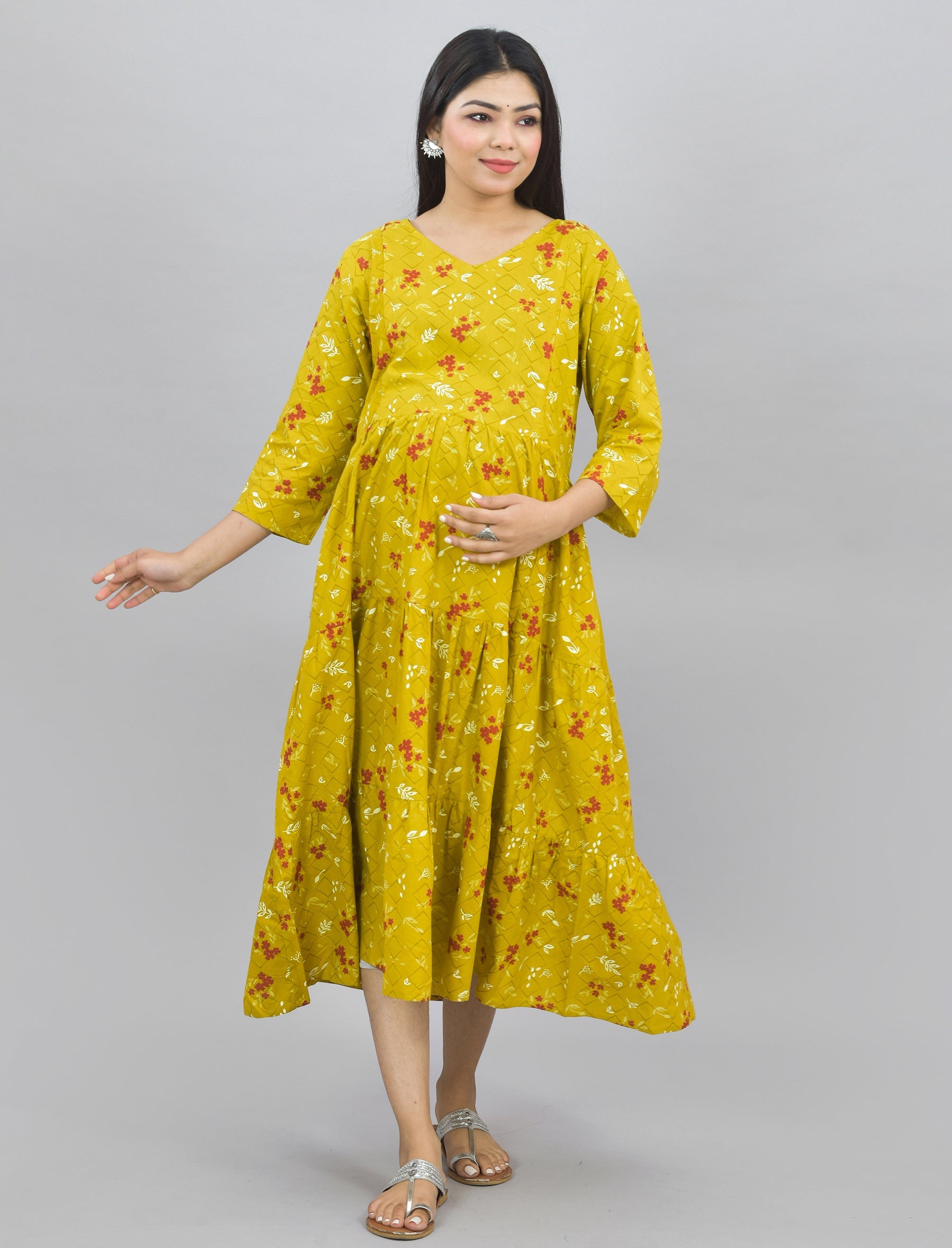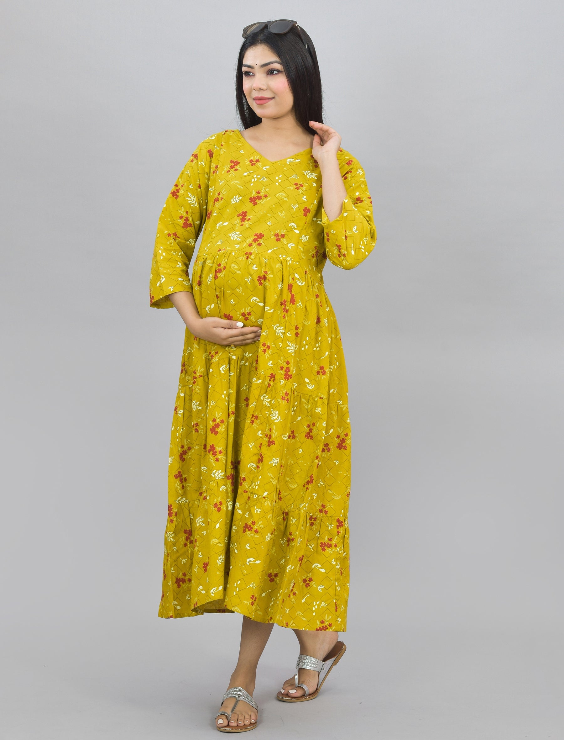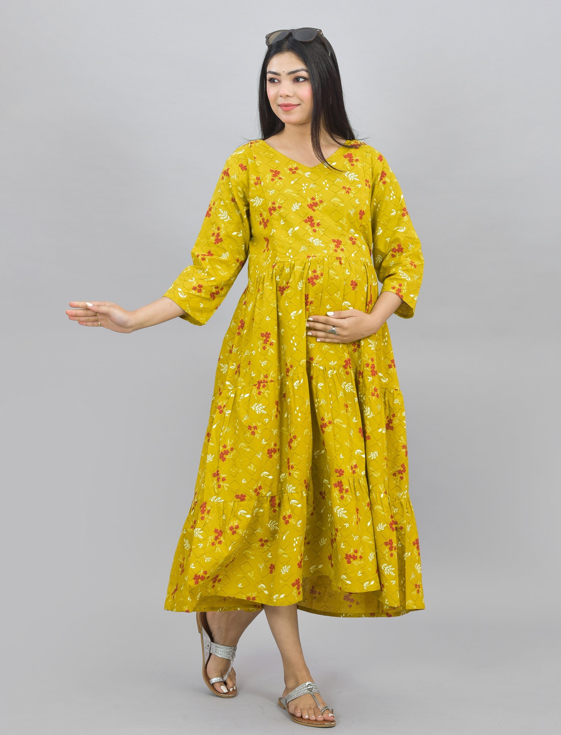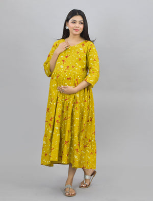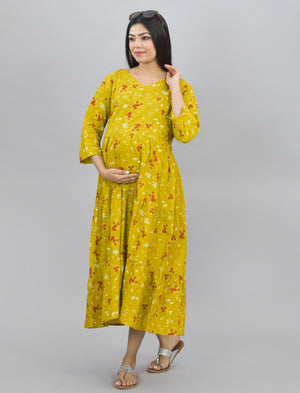 This mustard printed cotton maternity/feeding gown provides comfortable and stylish clothing for mothers. Made from soft, breathable cotton, this gown is designed for both maternity and nursing wear. With a beautiful print and functional design, it's a great choice for expecting and breastfeeding mothers.