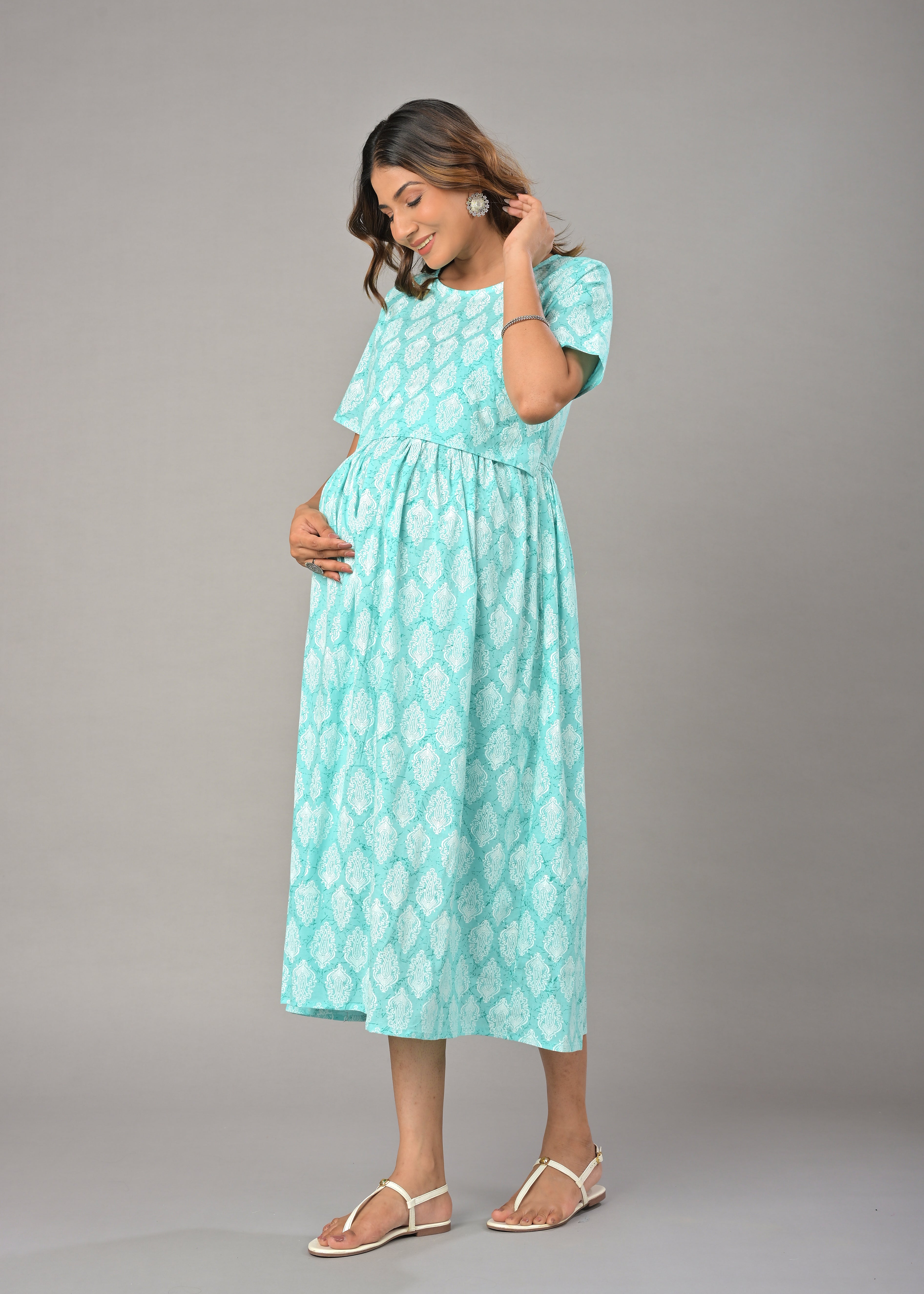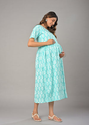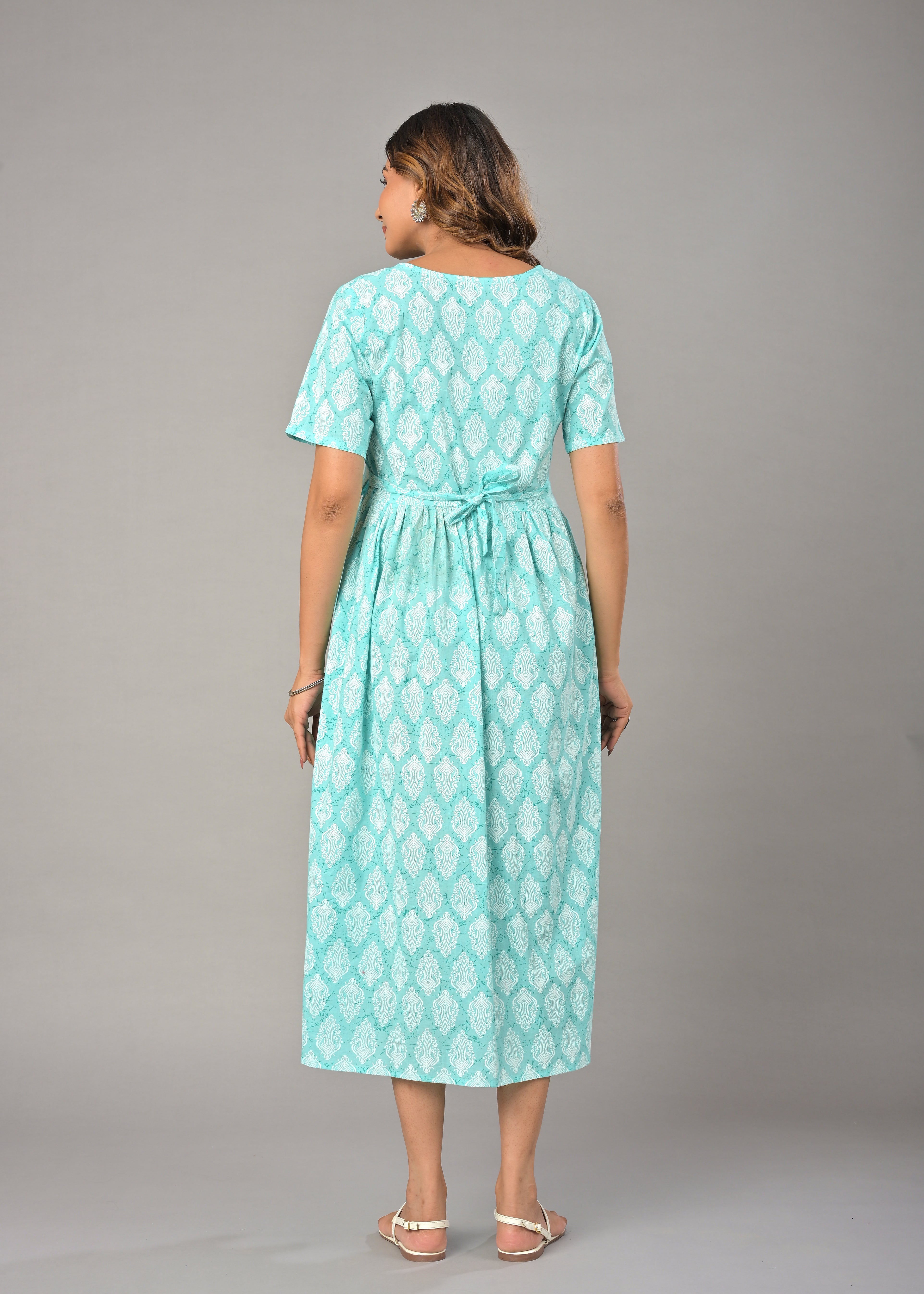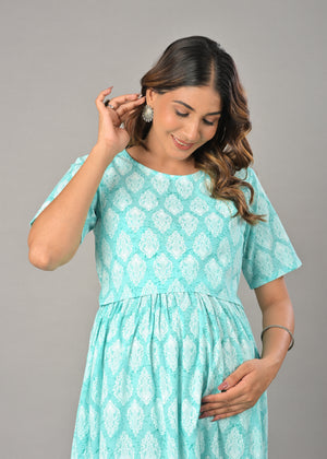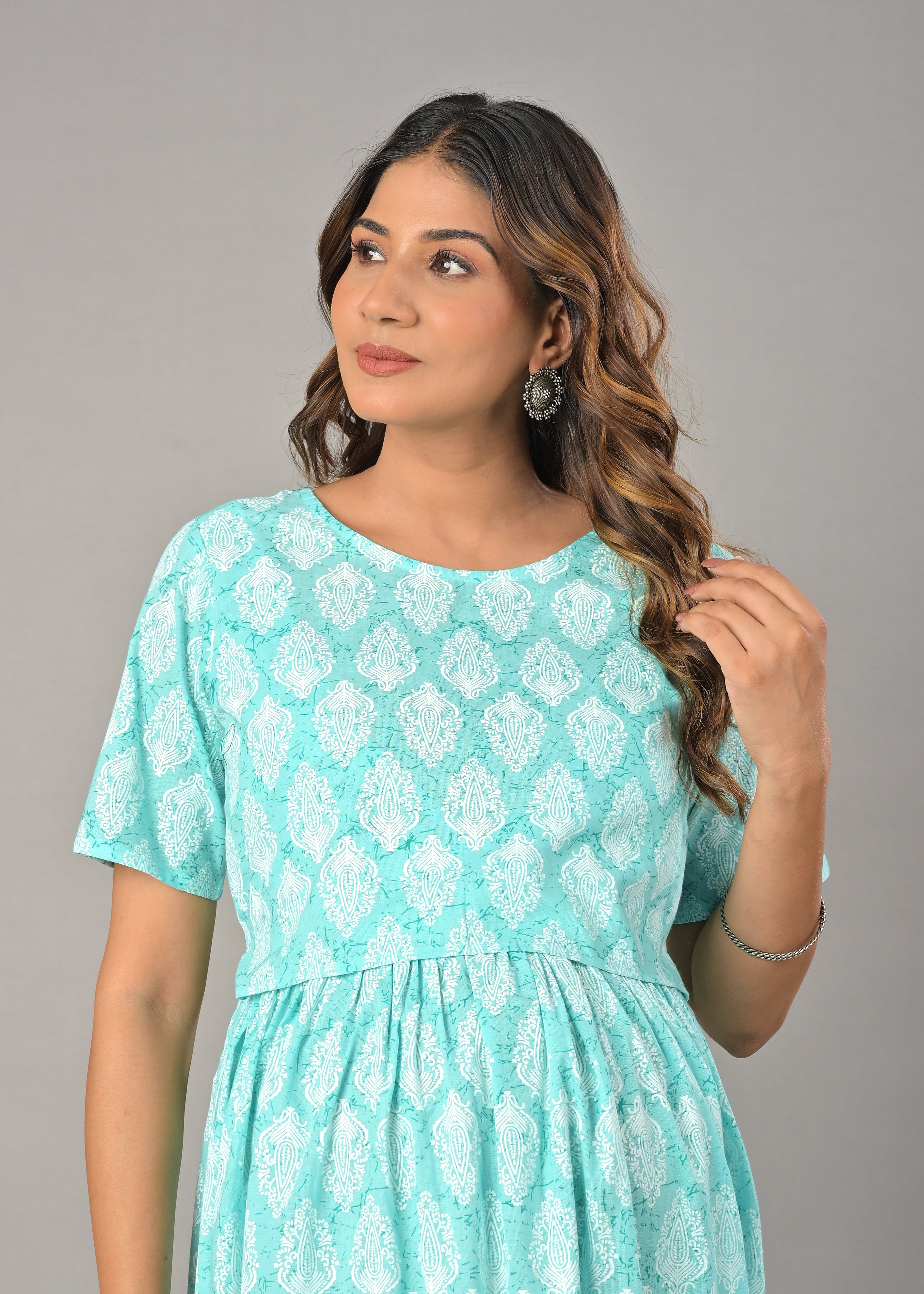 Turquoise Cotton Printed Maternity/Feeding Gown